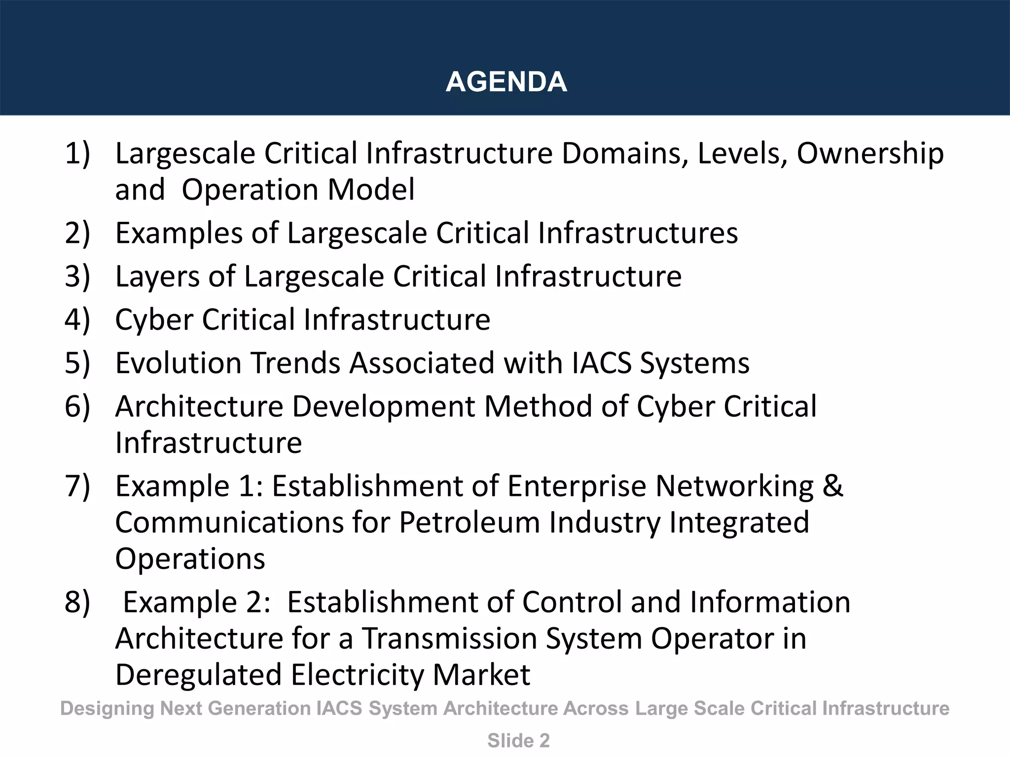 The document outlines the design of integrated control and information systems (IACS) for large-scale critical infrastructures across various domains such as electrical utilities, water, telecommunications, and oil & gas. It discusses infrastructure layers, ownership models, evolution trends, and provides examples of implementation for sectors like petroleum and electricity markets. Key trends include the convergence of IT and operational technology (OT), edge computing advancements, and the integration of digital business platforms.