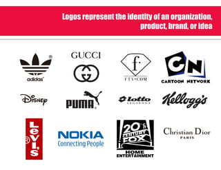 This document provides information and guidelines about logo design. It states that logos represent the identity of an organization and should be simple, effective at both large and small scales, and in color or black and white. Good logos clearly identify the organization. Logos can be descriptive by depicting what the organization does through images or symbols, or symbolic by representing concepts like knowledge. Fonts and colors used in logos should fit the brand's personality. The logo design process involves research, brainstorming, developing concepts, choosing fonts and colors, and finalizing the design. Logos can be redesigned over time to represent changes to an organization or to distinguish new services while keeping the core identity.