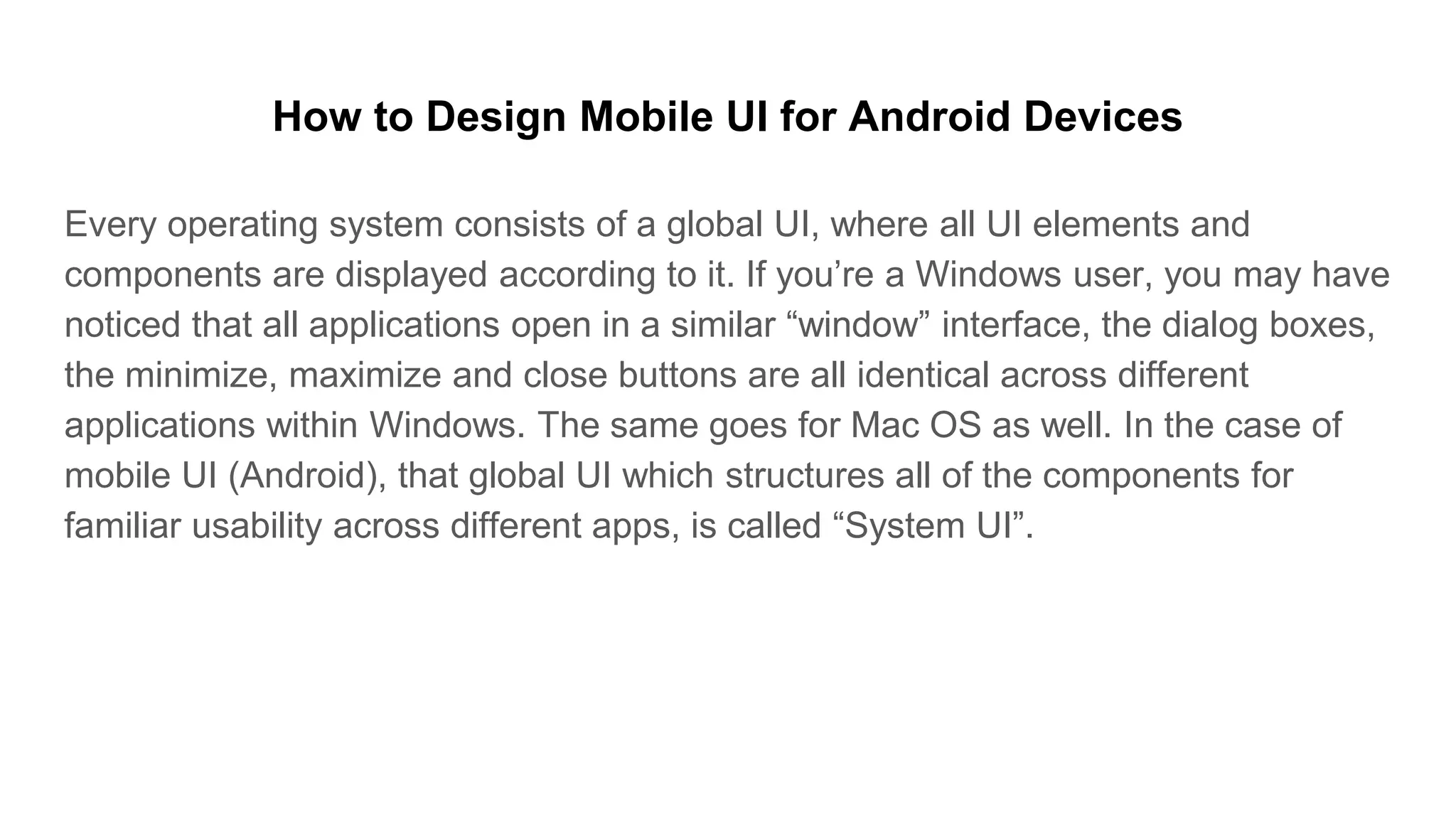 The document outlines mobile UI design principles for Android, focusing on the structured layout of components within the system UI. It covers key elements such as navigation layouts, action menus, selection options, typography, and app icon sizing. Adhering to these design guidelines ensures a consistent and familiar user experience across Android applications.