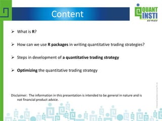 This document outlines a comprehensive guide on designing quantitative trading strategies using the R programming language and its associated packages, particularly 'quantstrat'. It details the steps involved in strategy development, including hypothesis formation, testing, refining, and implementing in a live trading environment. Additionally, it introduces an educational program on algorithmic trading offered by QuantInsti, designed for professionals looking to enhance their knowledge and skills in financial technology.