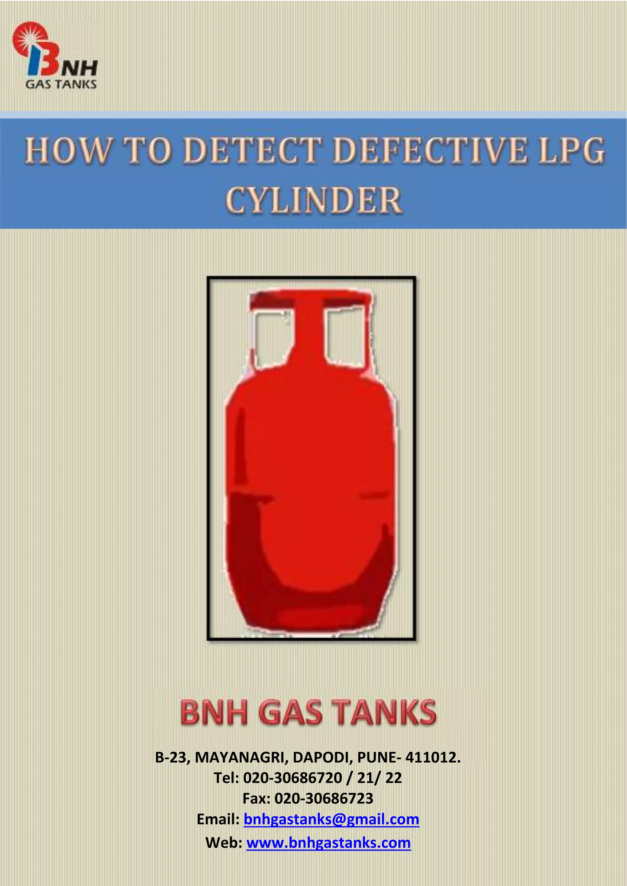 This document provides information on main causes of defects in LPG cylinders and how to detect a defective LPG cylinder. The main causes listed are inadequate supervision, faulty equipment/design, inadequate ventilation, and poor maintenance. It recommends inspecting the LPG tank carefully before purchase, checking for dents, getting an inspection from a qualified LPG serviceman, using the correct regulator and stove burner, and ensuring the burner produces a blue flame. More details can be found at the provided website.