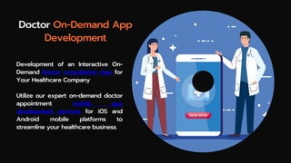 The document outlines the development of an on-demand doctor consultation app for healthcare companies, emphasizing the increasing consumer demand for mobile access to healthcare services. Key considerations for creating such an app include understanding the target audience, maintaining a strong network of doctors, and incorporating essential features. The benefits of these apps include enhanced accessibility for patients and increased online presence for doctors.