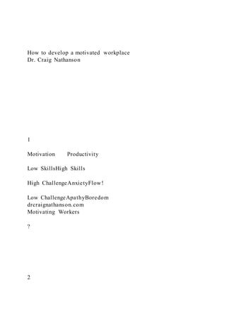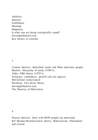 The document discusses various theories of motivation in the workplace, emphasizing the importance of understanding what motivates individuals to enhance engagement and productivity. It critiques traditional reward systems, suggesting that they can undermine intrinsic motivation and creativity, and proposes alternative approaches such as fostering collaboration and providing meaningful work. Additionally, it highlights the significance of adapting leadership styles to meet the diverse expectations of different generational groups in the workforce.