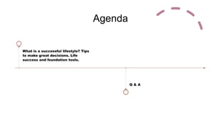 The document outlines tips for developing a successful lifestyle presented by the Wake-Up Foundation. It discusses establishing a lifestyle mindset focused on personal growth, happiness, and purpose. It recommends setting high expectation and inspiring goals, doing research, finding your own creative paths, and maintaining commitment, persistence, and consistency. The presentation also covers using life foundation tools like passion, goal setting, self-esteem, stress management, and good health to support success.