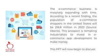 The document discusses how to develop a successful e-commerce app. It recommends understanding your objectives, adding advanced features, ensuring an engaging design, deploying trending technologies like React Native and Node.js, analyzing competitors, prioritizing security, integrating multiple payment gateways, and consulting an expert e-commerce development company. Building a robust e-commerce app requires vast experience and skills, so the document suggests partnering with an experienced solutions provider.