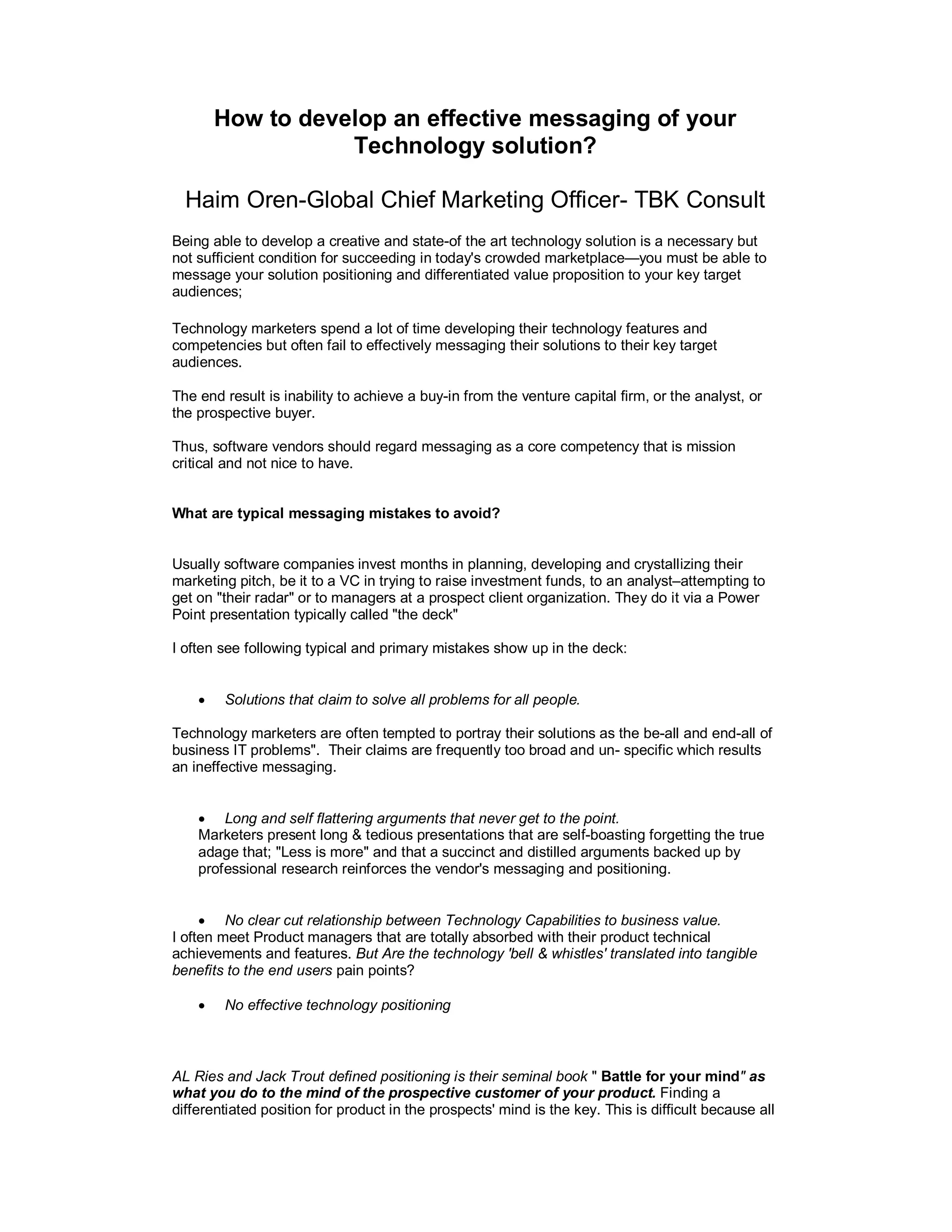 Effective messaging is crucial for technology solutions, as mere creation of a product is insufficient for success in a competitive market. Common mistakes include overly broad claims, verbose presentations, and failure to connect technology capabilities to real business value. To improve messaging, marketers should focus on understanding their target audience, clearly articulating benefits, using customer testimonials, and distinguishing their solutions from competitors.