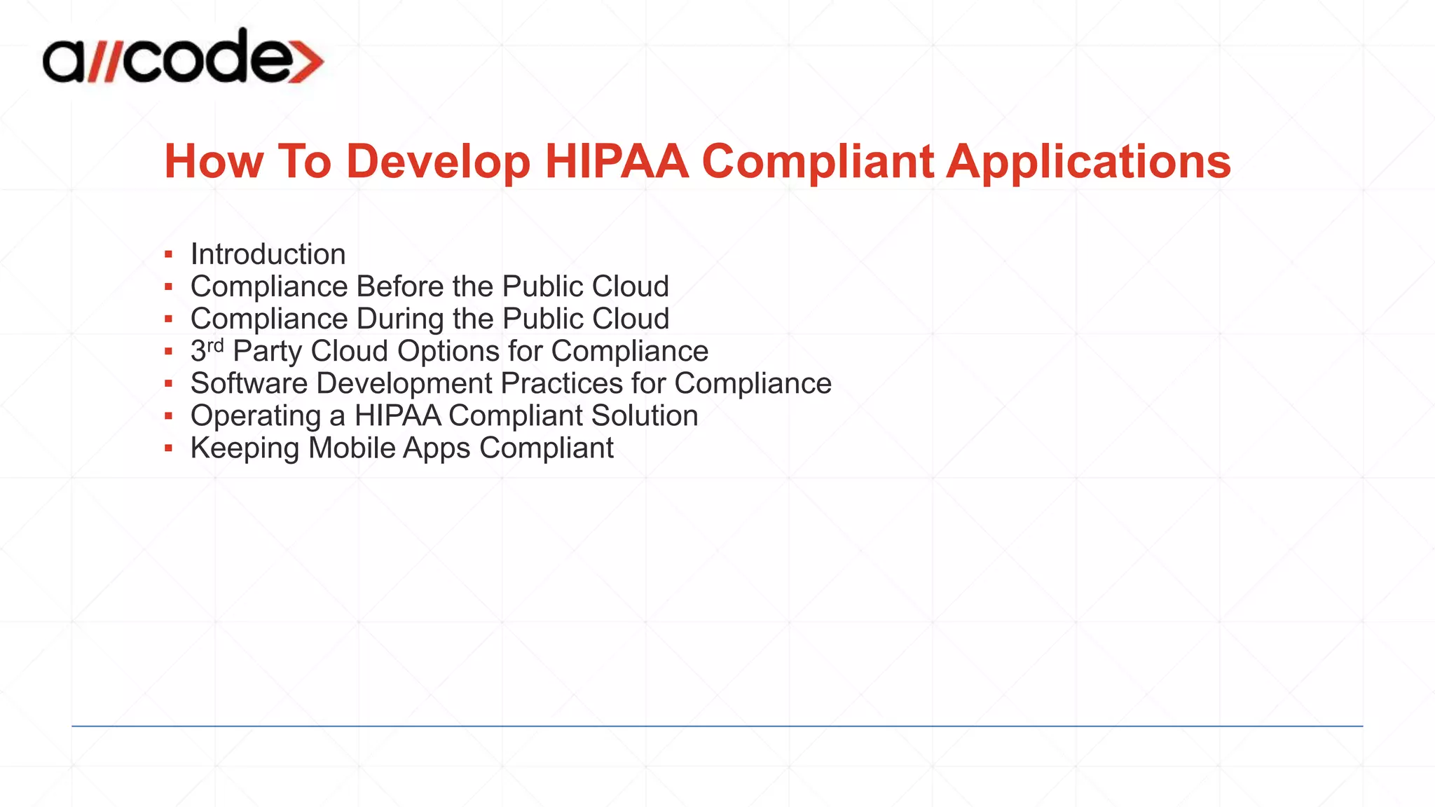 This document discusses best practices for developing HIPAA compliant applications, focusing on cloud and mobile applications. It covers compliance requirements before and during use of public clouds, recommends using a HIPAA compliant cloud provider and signing a business associate agreement. It also discusses software development practices like separating environments, data integration and third party integrations. Additional topics include operating a HIPAA compliant solution, and keeping mobile apps compliant by encrypting data and limiting PHI in notifications.