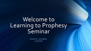 This document provides information on developing the gift of prophecy. It begins by welcoming participants to a seminar on learning to prophesy. It then discusses that prophecy involves speaking words of edification, exhortation and comfort. It encourages pursuing the gift of prophecy and outlines several ways to develop the prophetic gift, including coveting the gift, releasing faith through God's word, operating in the anointing through worship, being around anointed people, triggering the gift at appropriate times, discerning the spirit, and stirring up the gift through reading scripture aloud. It concludes by providing two prophetic declarations for participants to learn and declare over their own lives concerning favor and blessing.