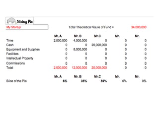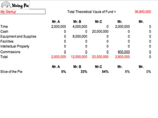 The document discusses a method for fairly dividing equity among business partners using dynamic equity splits as proposed by Mike Moyer in 'Slicing Pie.' This approach assigns value to actual contributions, encouraging motivation and accommodating changes within the team. It emphasizes that individuals should receive equity proportional to their contributions to the business.