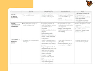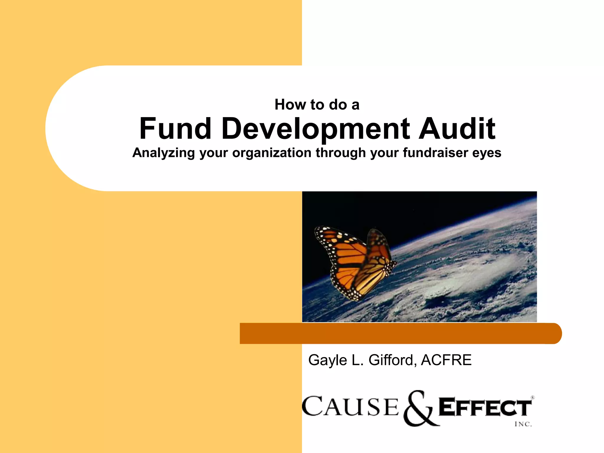 This document outlines the process for conducting a fund development audit, emphasizing the need for comprehensive assessment and strategic improvement in fundraising organizations. Key components include external and internal scans, data reviews, and interviews with various stakeholders to benchmark and analyze fundraising effectiveness. The audit aims to identify strengths, weaknesses, and opportunities to enhance the organization's fundraising strategy.