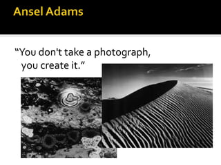Photography is about capturing beauty in ordinary things through perspective and composition. It is a way of looking at the world and finding the essence of a subject. When taking portraits, photographers should frame their subjects to focus attention, consider backgrounds, experiment with different angles and shots, make subjects comfortable, and highlight each subject's uniqueness.