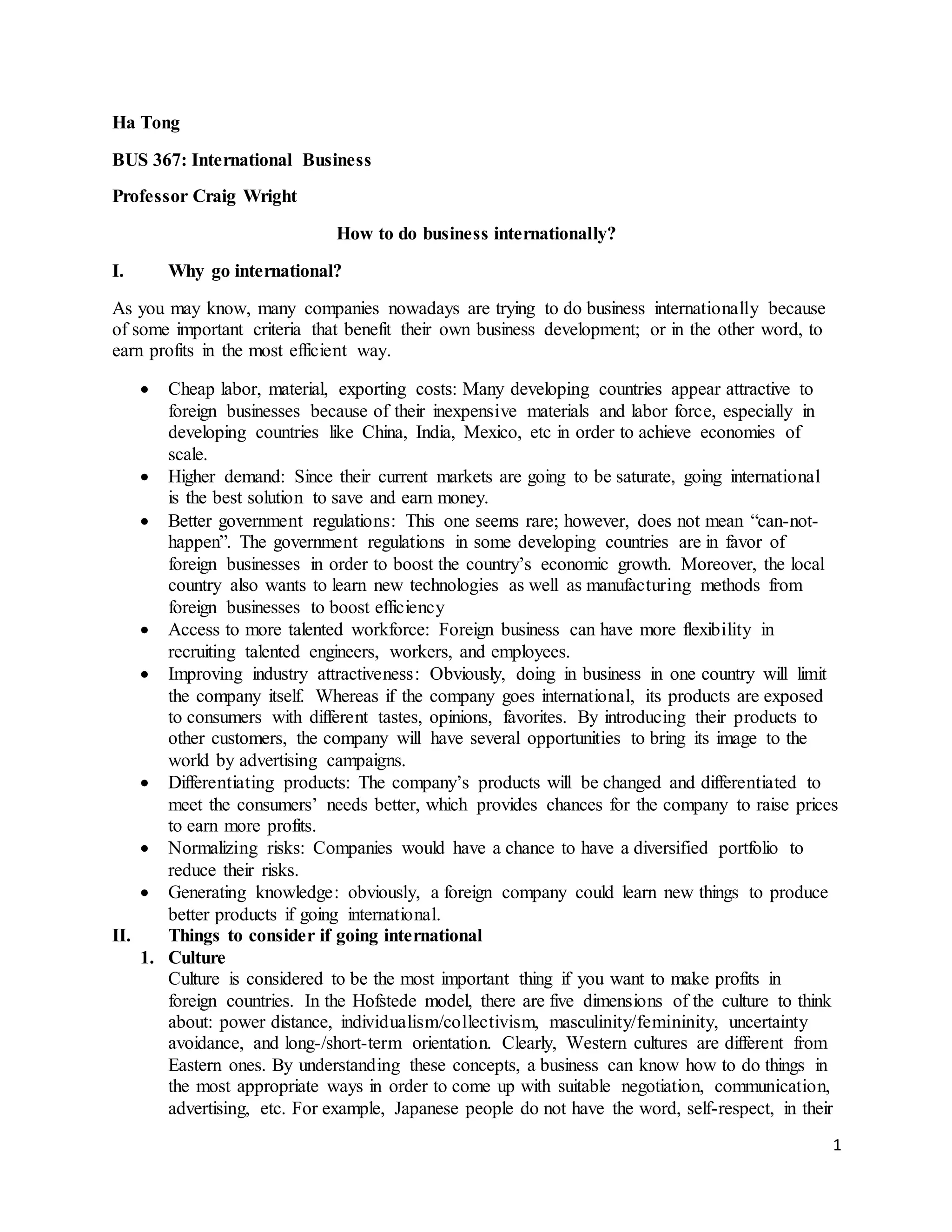 1. The document discusses factors for companies to consider when doing business internationally, including cheap labor costs, access to new markets, government regulations, and more.