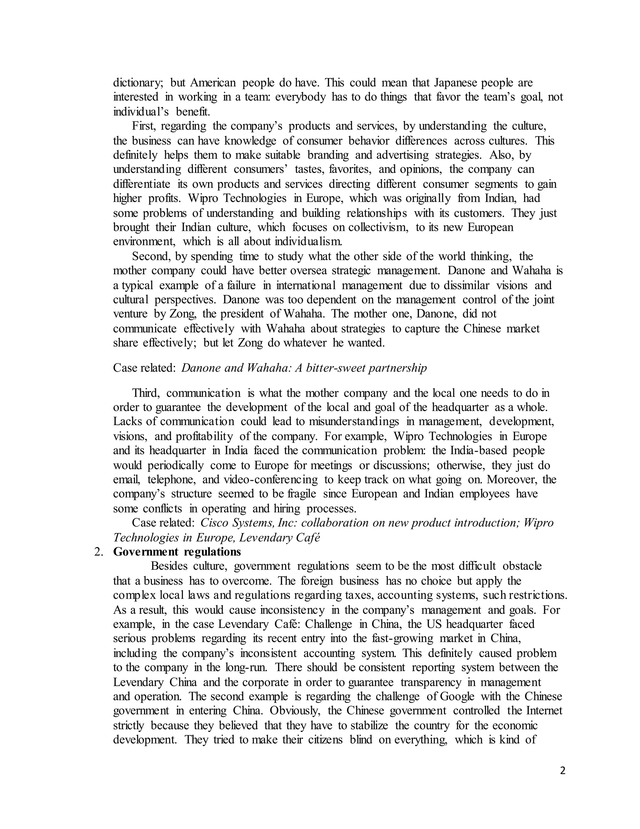 2. When expanding internationally, companies must consider cultural differences in areas like communication, negotiation, and consumer preferences. They must also adapt to varying government regulations across countries.