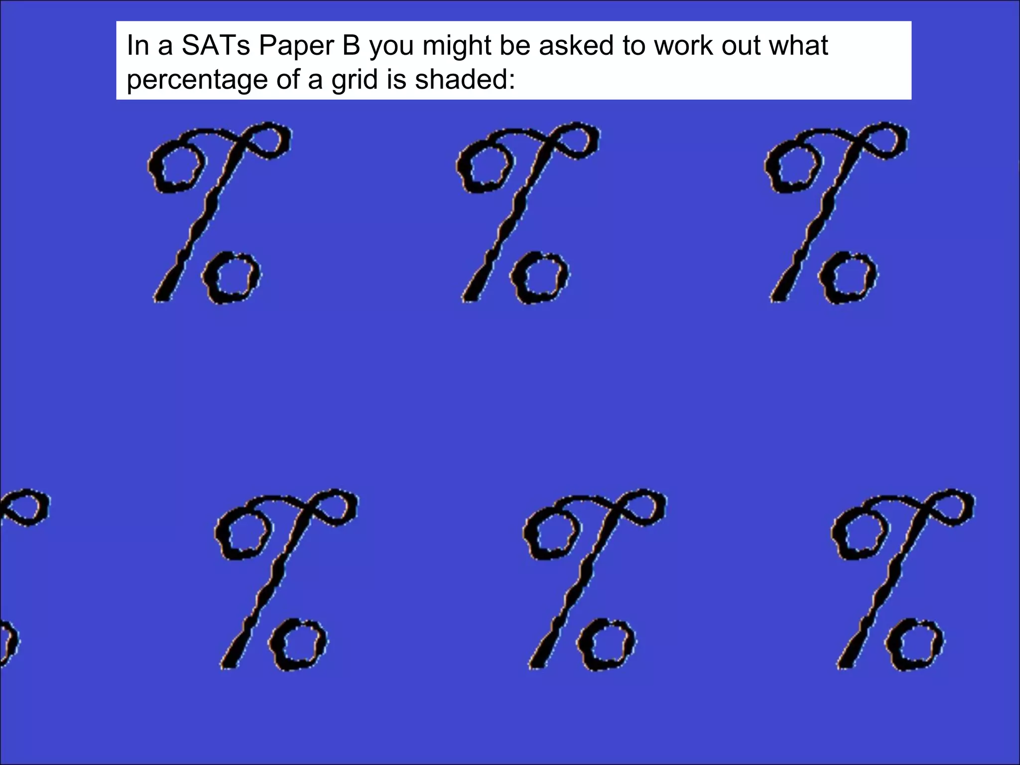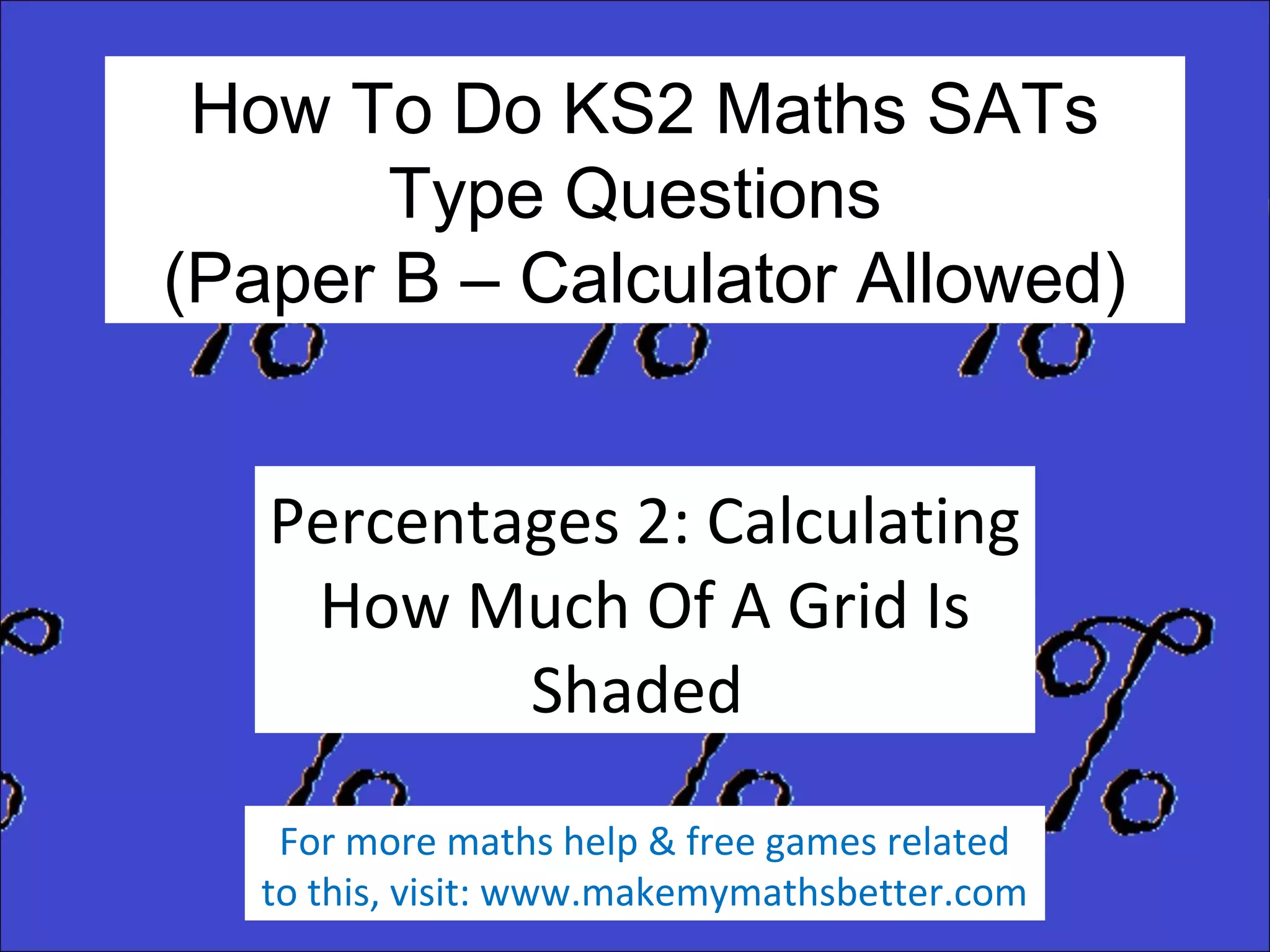 This document provides instructions for calculating percentages from grids for KS2 maths SATs questions. It explains that you count the number of shaded or colored tiles, express it as a fraction of the total tiles, and convert that fraction to a percentage by changing the denominator to 100. Two examples are shown step-by-step: calculating that 6 out of 20 tiles shaded is 30% and 14 out of 50 tiles green is 28%. The document ends by providing three practice problems for the reader to solve.