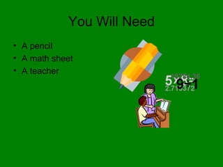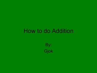 This document provides instructions for how to do addition. It states that you need a pencil, math sheet, and teacher. You should write your name, add the numbers, write the answer, and show your teacher. If you make mistakes, fix them and have the teacher correct them. As a trick, if the number on the bottom is bigger, pretend the bigger number is on top and the smaller is on the bottom.