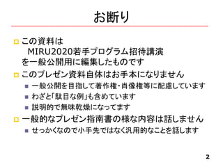 MIRU2020若手プログラム招待講演のスライドを一般公開用にアレンジしたものです。日本語で書かれています。下記の点にご注意ください