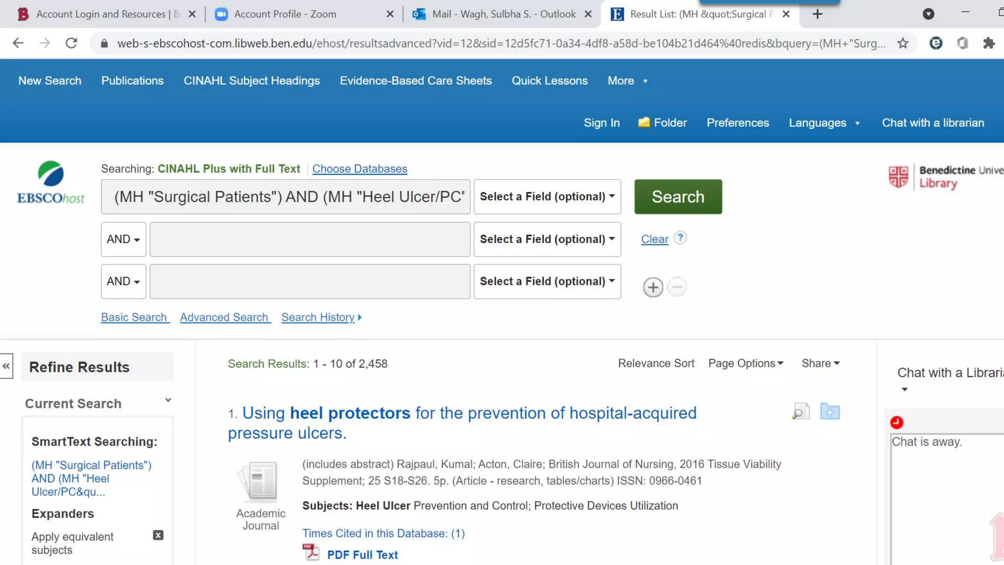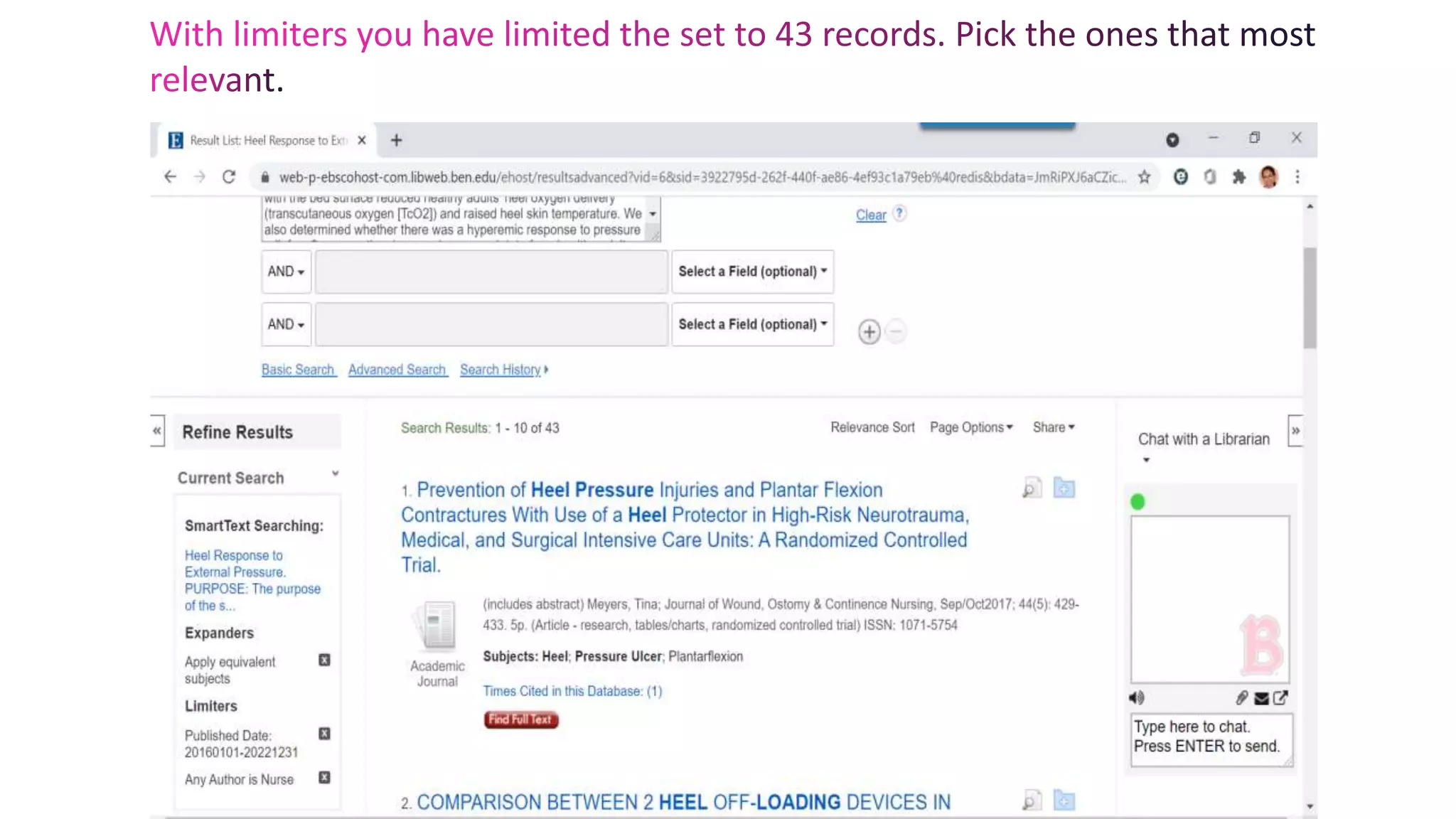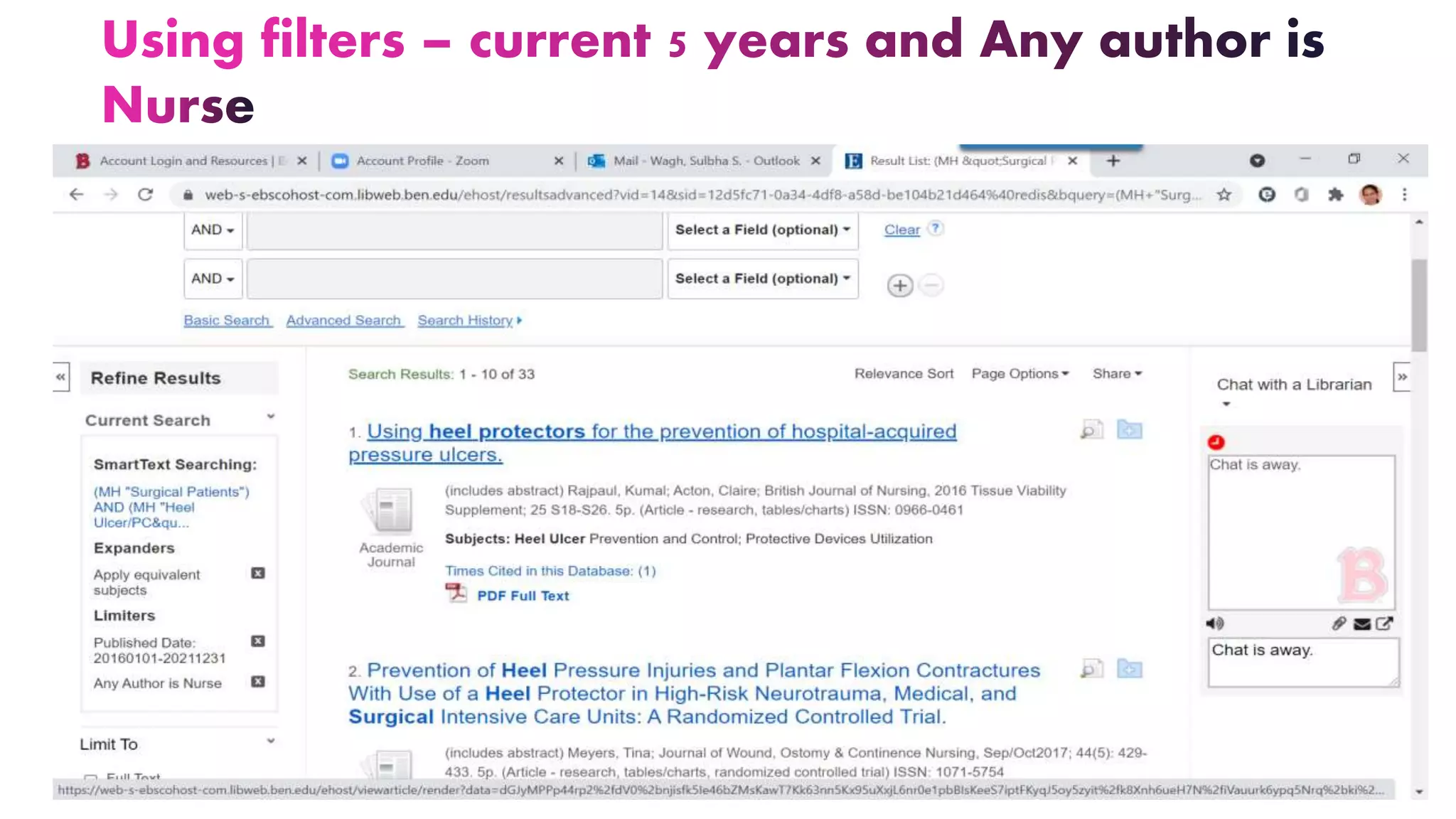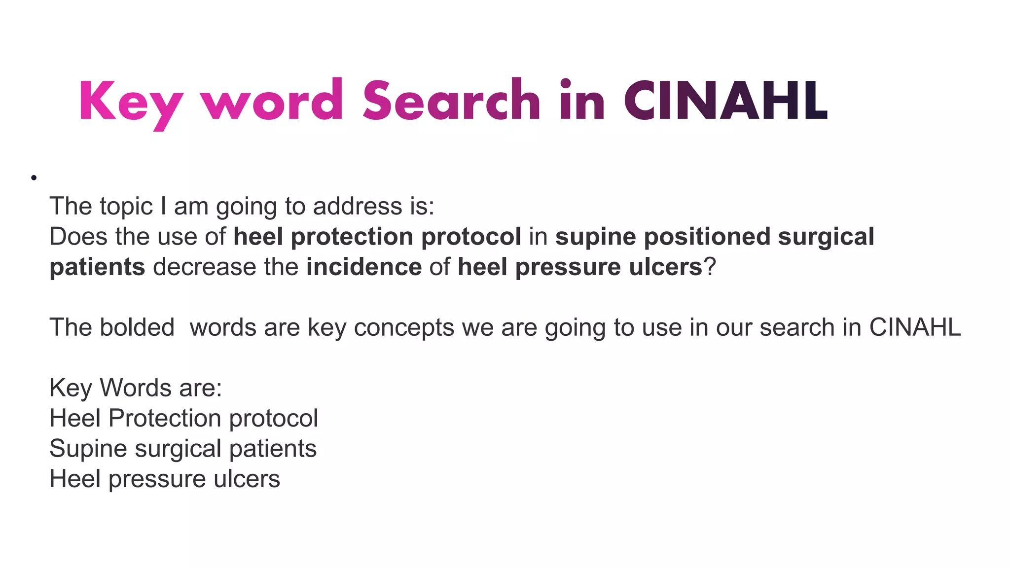 This document provides instructions for conducting a PICOT search to answer the question "Does the use of heel protection protocol in supine positioned surgical patients decrease the incidence of heel pressure ulcers?". It explains the PICOT components of patient population, intervention, comparison, outcome, and time. Keywords are identified for each PICOT element from the question. The PICOT search form organizes keywords by PICOT component and indicates whether related terms should be searched with "OR" or "AND". The document directs searching CINAHL using subject headings converted from keywords and filters such as limiting to the last 5 years. It notes a search of this question retrieved 33 relevant citations.
