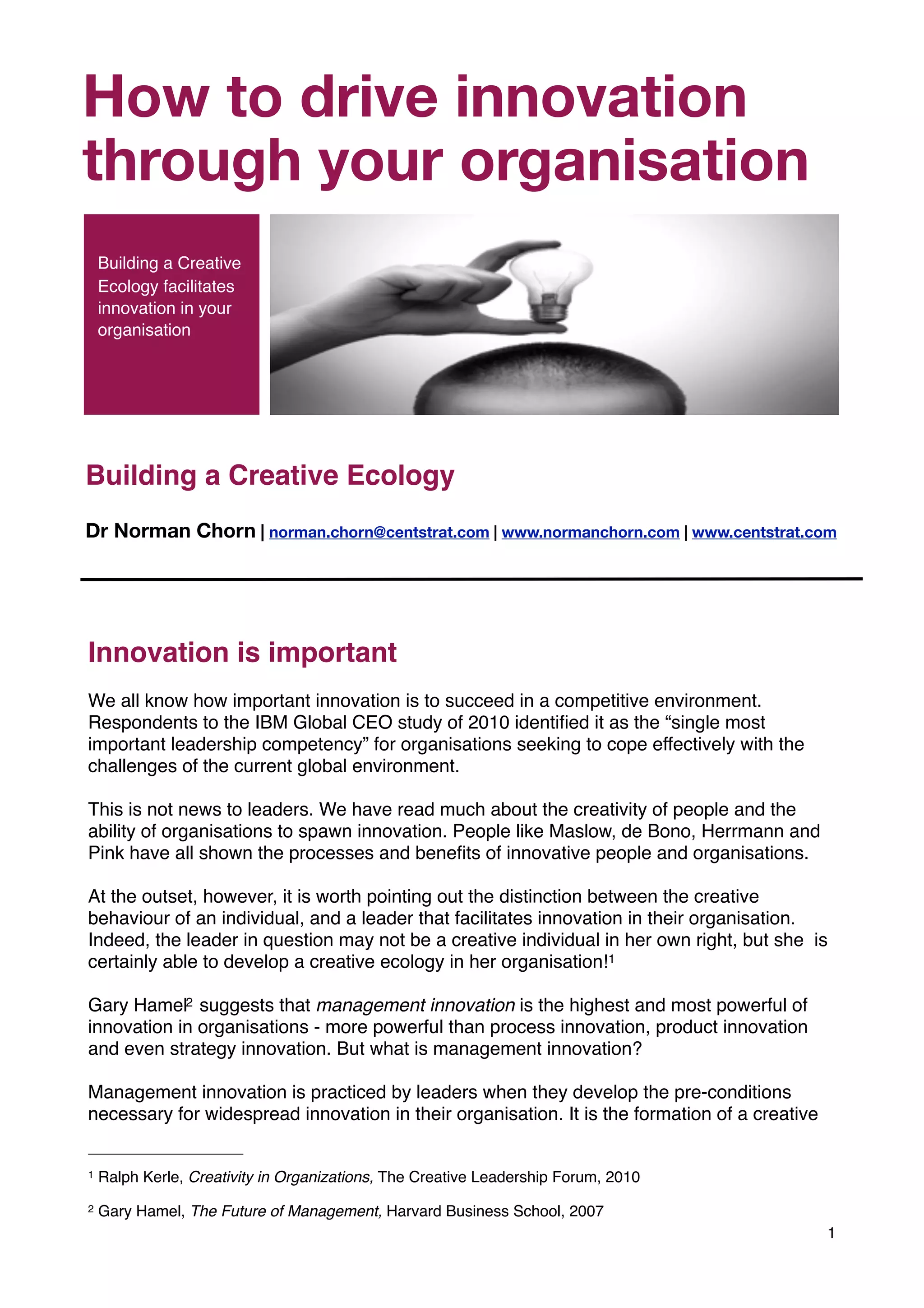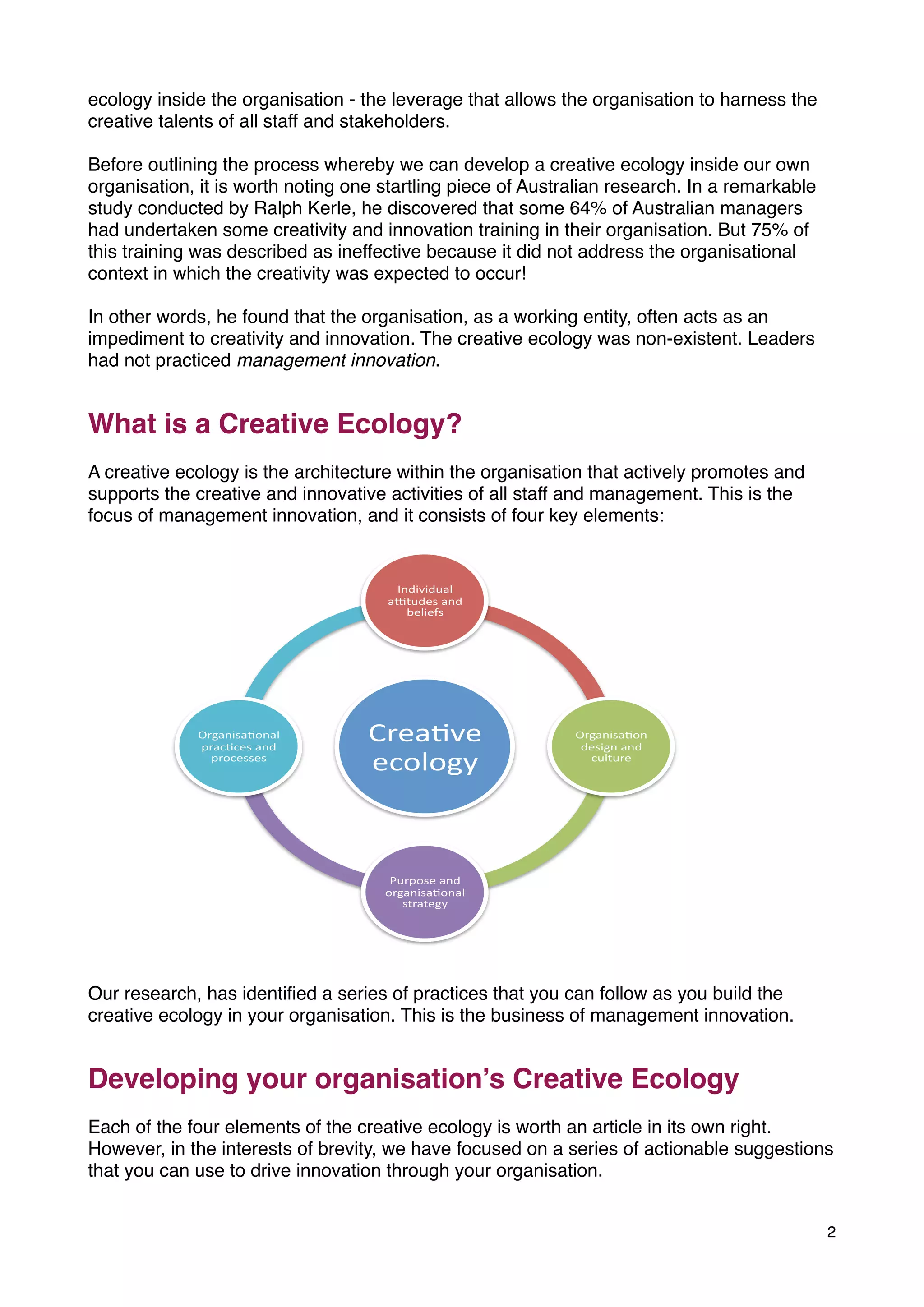 The document discusses the importance of innovation within organizations, highlighting that leadership plays a crucial role in fostering a creative environment rather than being solely responsible for creativity. It introduces the concept of 'creative ecology'—the organizational structure that supports innovation—and outlines actionable practices that leaders can adopt to enhance creativity and innovation across their teams. Key elements include defining a clear purpose, engaging employees, and recognizing the value of diverse perspectives to drive organizational change and success.