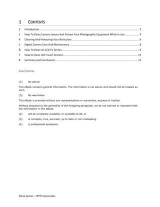 This ebook provides comprehensive guidelines on cleaning and maintaining various photographic and electronic devices, including camera lenses, binoculars, digital cameras, LCD TVs, and touch screens. It emphasizes the importance of proper cleaning techniques to avoid damage and ensure optimal performance. By following the recommended practices, users can maintain their equipment to prolong its lifespan and keep it in excellent condition.