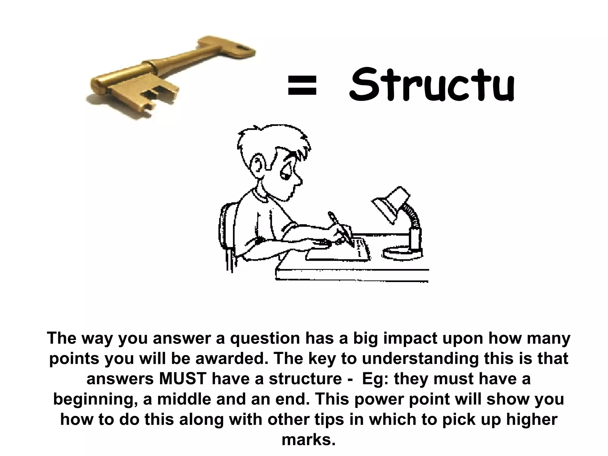 The document provides tips for answering exam questions effectively. It advises to structure answers with a beginning, middle, and end. Read the question carefully and underline key words to use in the answer. The first paragraph should directly answer the question. The second paragraph should back up points using transition words. The conclusion should summarize points and identify the most important reason.