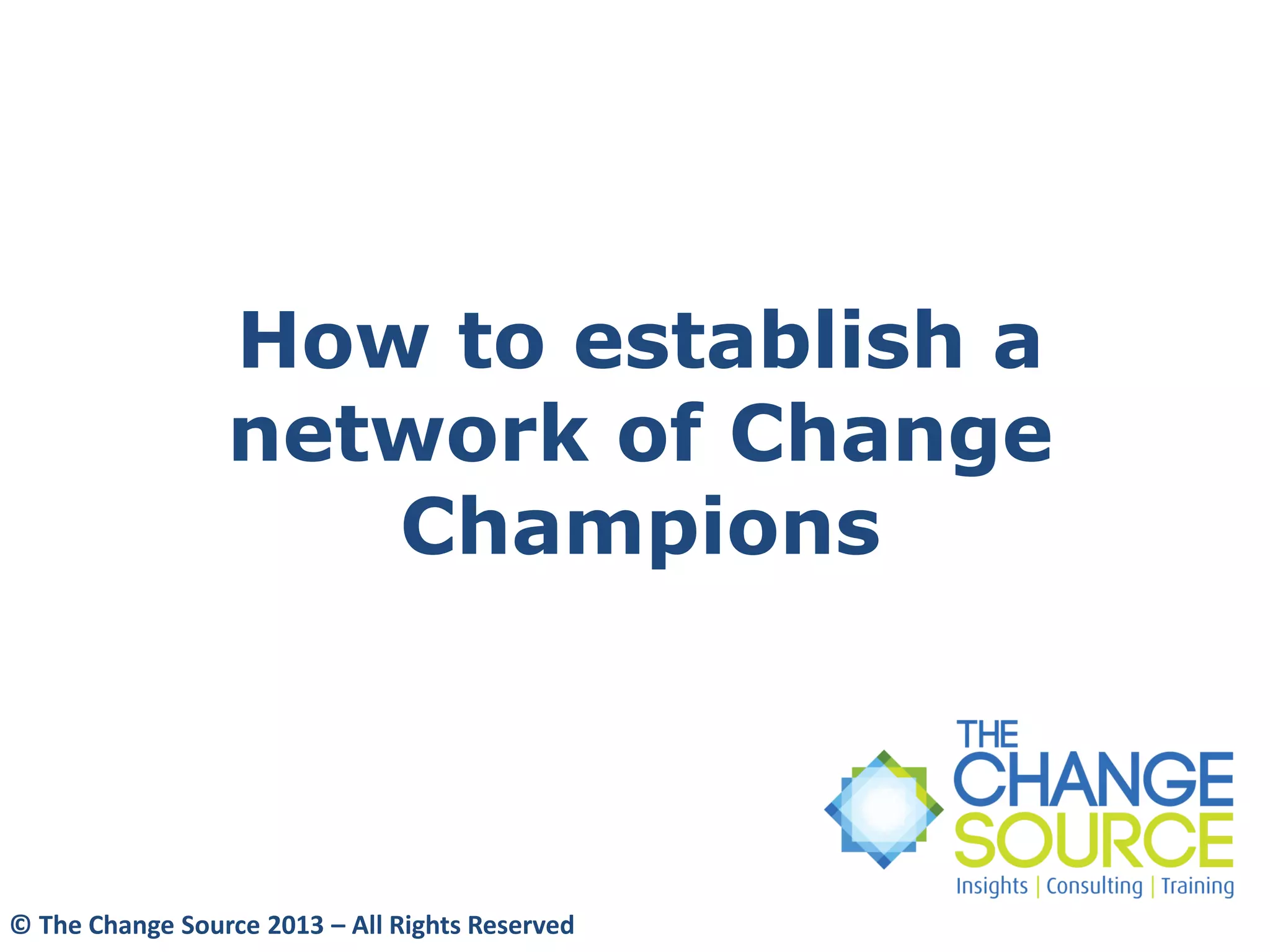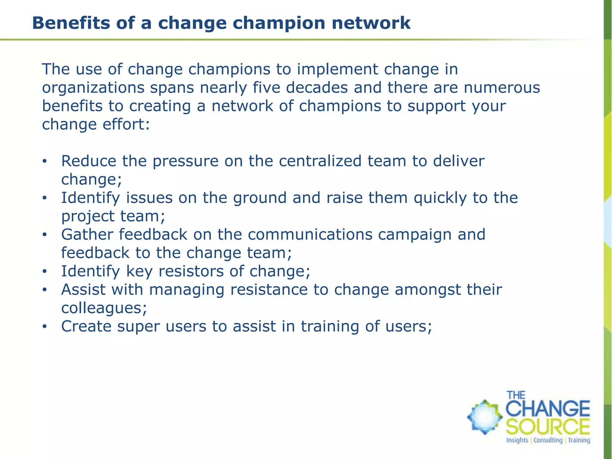 The document discusses establishing a network of change champions to support organizational change efforts. It outlines benefits of a change champion network such as reducing pressure on centralized teams and identifying issues. It provides sample objectives, roles and responsibilities, criteria, and collaboration methods for the network. The next steps proposed are conducting an introductory session for champions and having them meet to discuss and agree upon various aspects of their roles. Communicating and rewarding the champion network is also recommended.