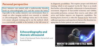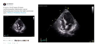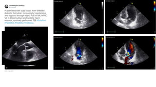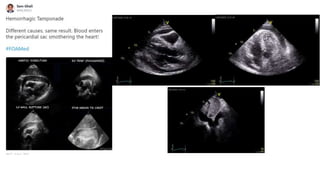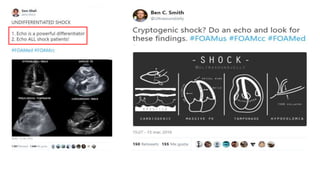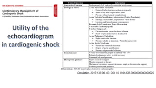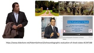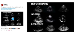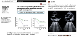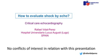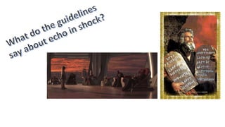 This presentation discusses how to evaluate shock using echocardiography. It defines shock and describes the main types: hypovolemic, cardiogenic, obstructive, and distributive. Guidelines recommend using echo to evaluate shock. The presentation reviews how to assess left ventricular systolic function, volume status, valvular pathology, and diastolic function. It provides examples of using echo to diagnose specific causes of shock like sepsis, myocardial infarction, pulmonary embolism, and tamponade. The key messages are that echo is very useful for diagnosing and managing shock, and training in point-of-care ultrasound is important.