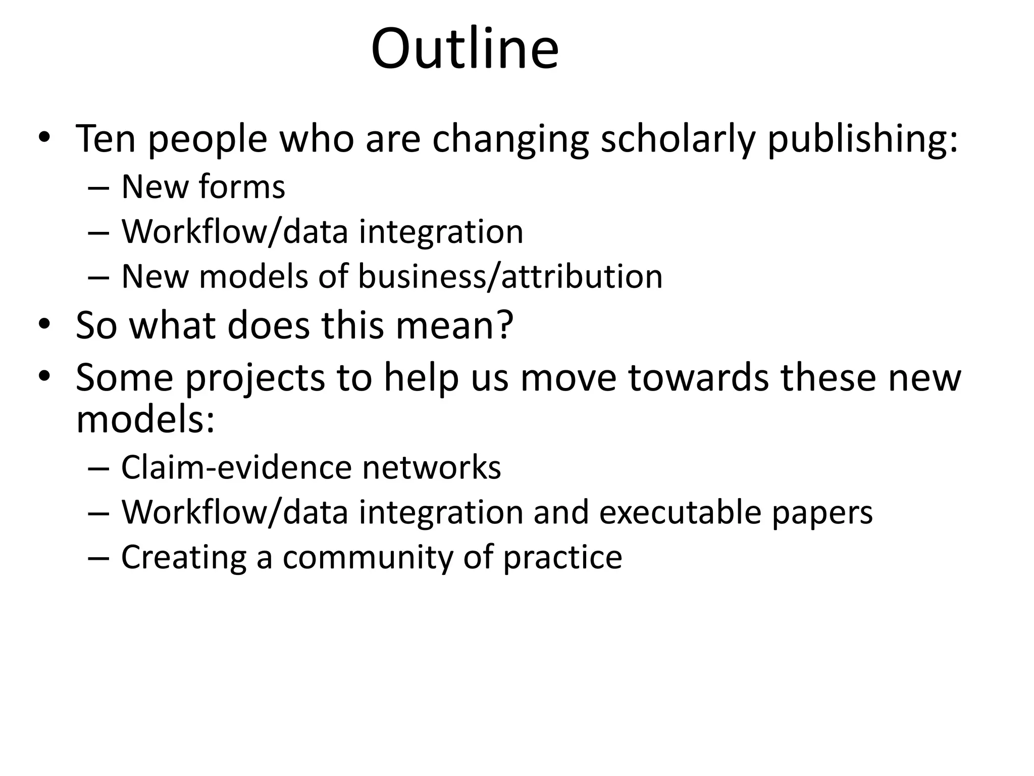 The document outlines key innovations and challenges in scholarly publishing, focusing on new publication formats, workflow integration, and alternative attribution models. It discusses various projects aimed at enhancing research accessibility and collaboration, including claim-evidence networks and executable papers. The future of scholarly communication emphasizes the importance of data sharing, citizen science, and the evolving role of publishers and libraries in this new landscape.