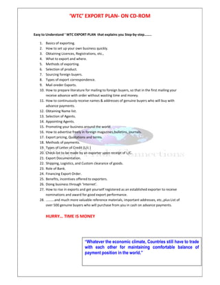 The document promotes starting an export business through a WTC Export Plan. It claims the plan [1] teaches anyone to become an exporter regardless of experience and earn a high income working part-time or full-time from home, [2] provides step-by-step guidance on how to identify foreign buyers, export products, and earn profits, and [3] offers additional benefits like advisory support, buyer introductions, and notifications to help members grow their export business. The plan aims to help people start and succeed in exporting for both income and helping the country's economy.