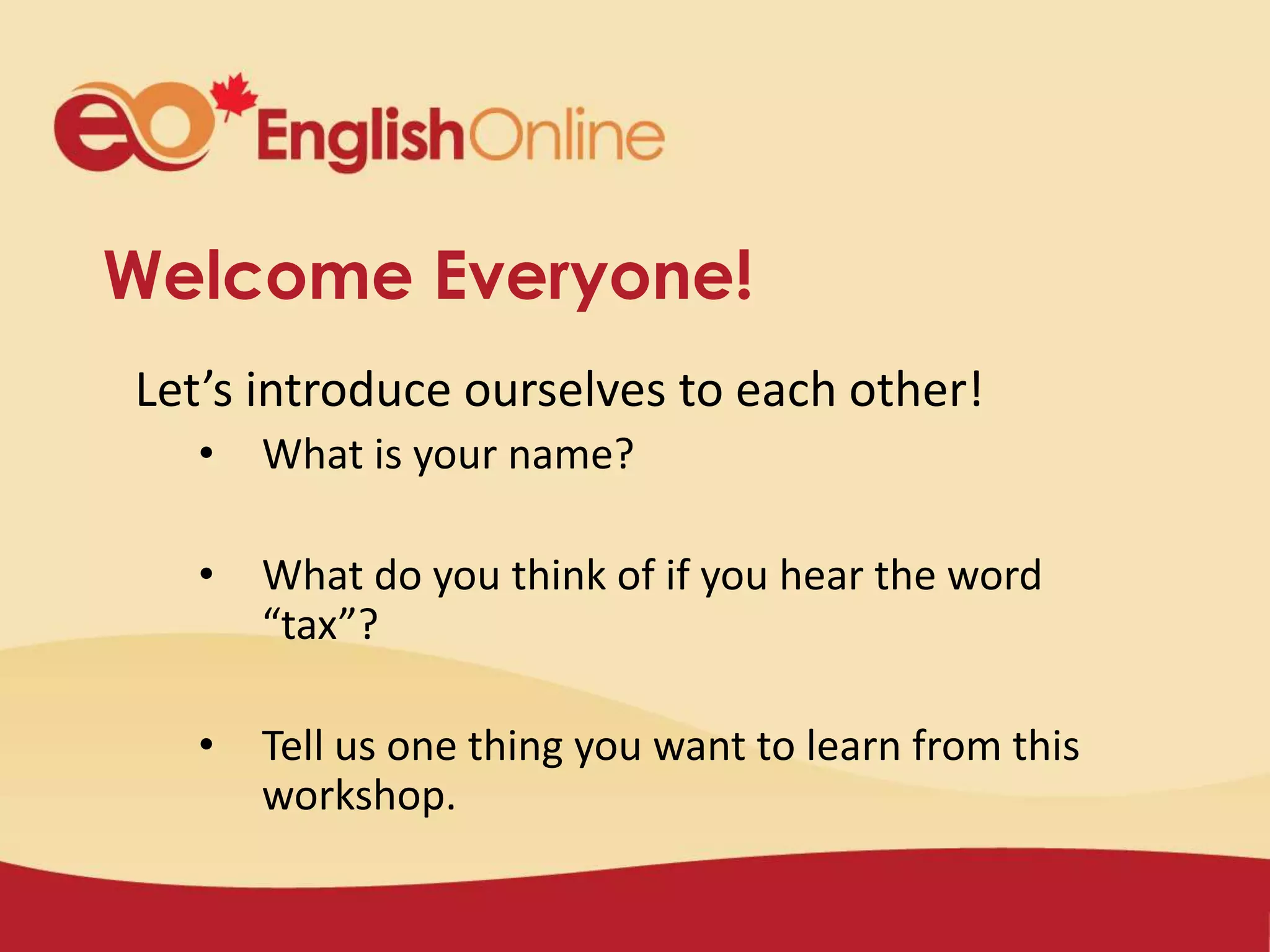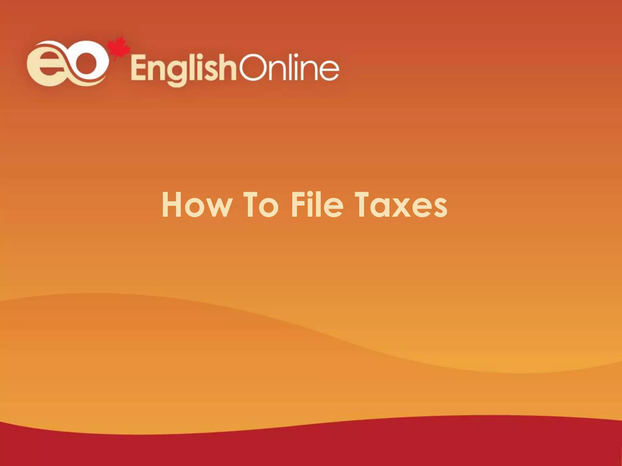 This document provides information about filing taxes in Canada. It begins with introducing the workshop objectives, which are to learn about the Canadian tax system, the tax filing process, and how to get help with taxes. Various tax-related terms are defined. The document then discusses the different types of taxes Canadians pay, including income, sales, and property taxes. It explains why taxes are paid and what common benefits are funded by taxes, such as social services, healthcare, education, and public services. The document outlines the tax filing process and how to determine your taxable income and tax bracket. It provides details on getting tax forms, filing options, deadlines, and setting up direct deposit. Tax credits are described and information given on where