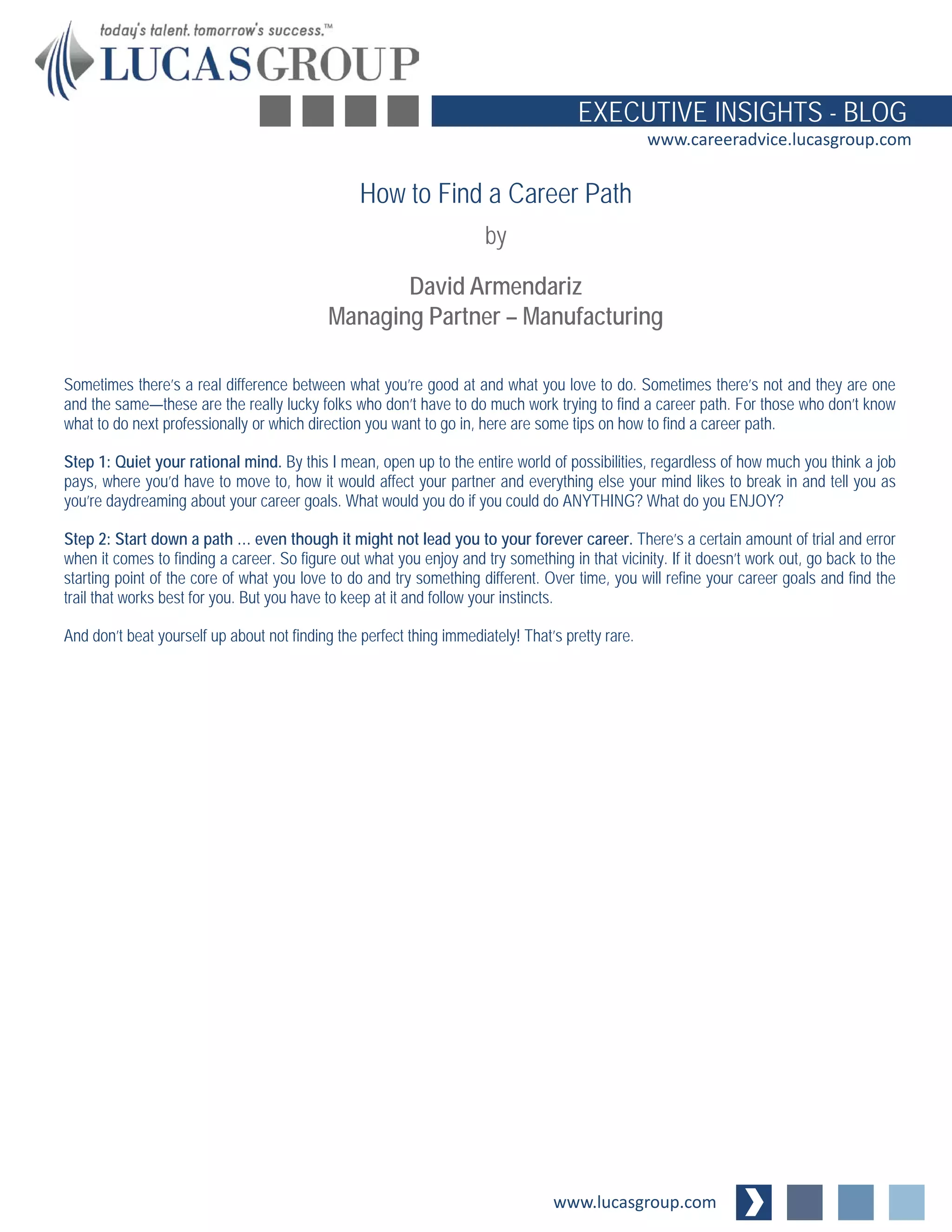 The document provides tips for finding a career path for those who are unsure of their professional direction. It recommends quieting the rational mind to consider any possibility regardless of preconceived limitations. The second tip is to reflect on personal interests and strengths, such as preferred work environments and whether one enjoys working independently or with others. The final tip is to start down a potential path, accepting it may not be permanent, and use trial and error to refine goals over time by following instincts.