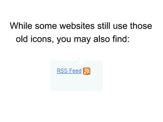 The document provides guidance on locating RSS feeds on websites, highlighting the use of traditional RSS icons. It suggests searching for the RSS symbol as a primary indicator. The information is aimed at helping users navigate websites that still utilize these older icons.