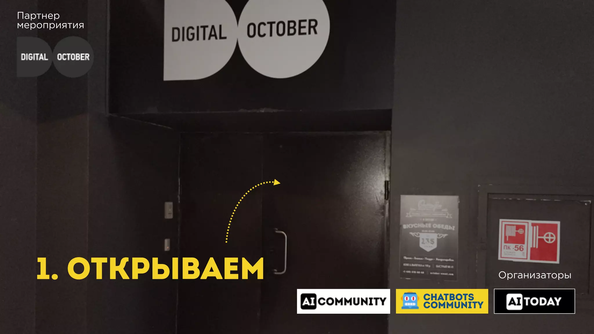 Документ описывает процесс нахождения встречи сообщества ИИ на цифровом октябре. Указаны шаги, начиная с посещения сообщества чат-ботов и заканчивая прибытием в конференц-зал. Также содержатся благодарности организаторам и участникам мероприятия.