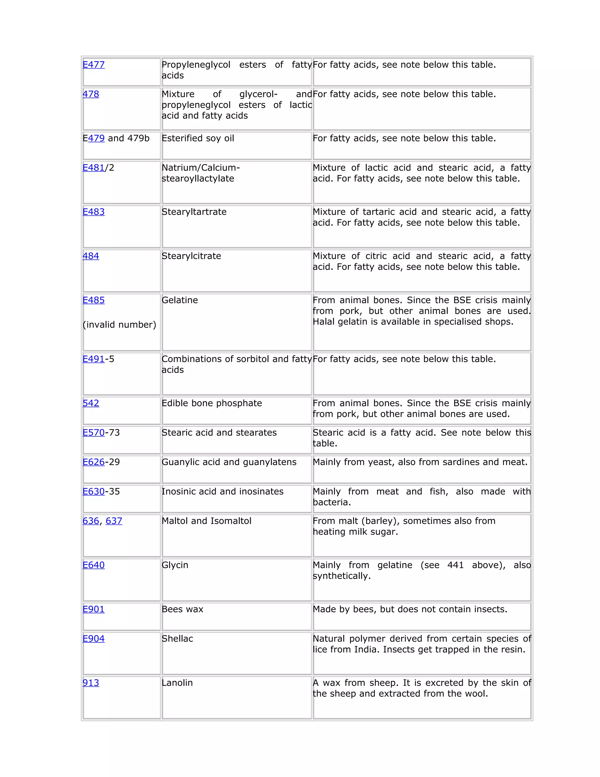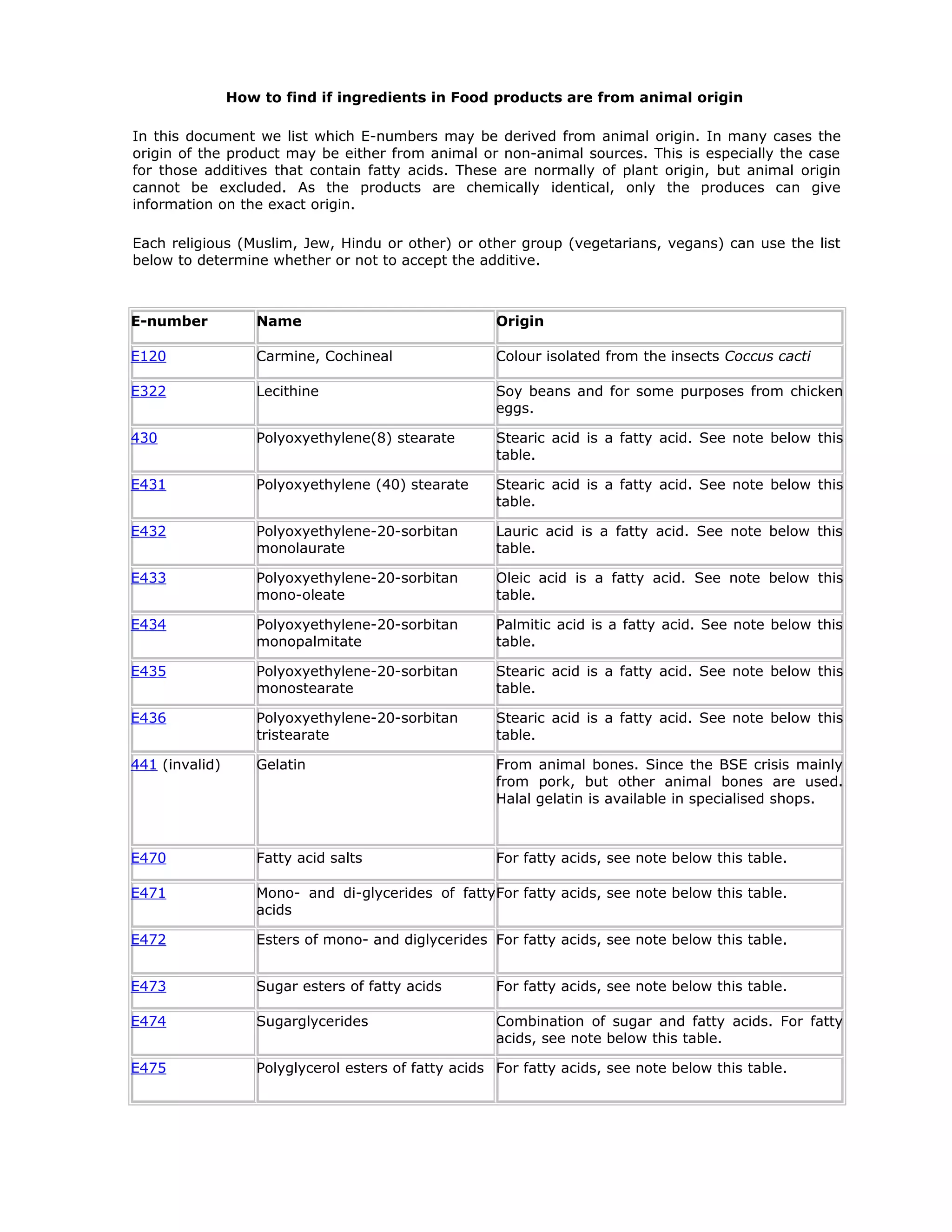This document provides information on identifying whether food additives and ingredients are derived from animal sources. It lists various E-numbers and explains whether their origin is animal, plant, or either depending on what the producer uses. For additives derived from fatty acids, the origin could be animal or plant since chemically they are identical. The document encourages religious groups to check with producers about the exact source. It provides a table of common ingredients that often come from animals such as casein, gelatin, lactose, and whey.