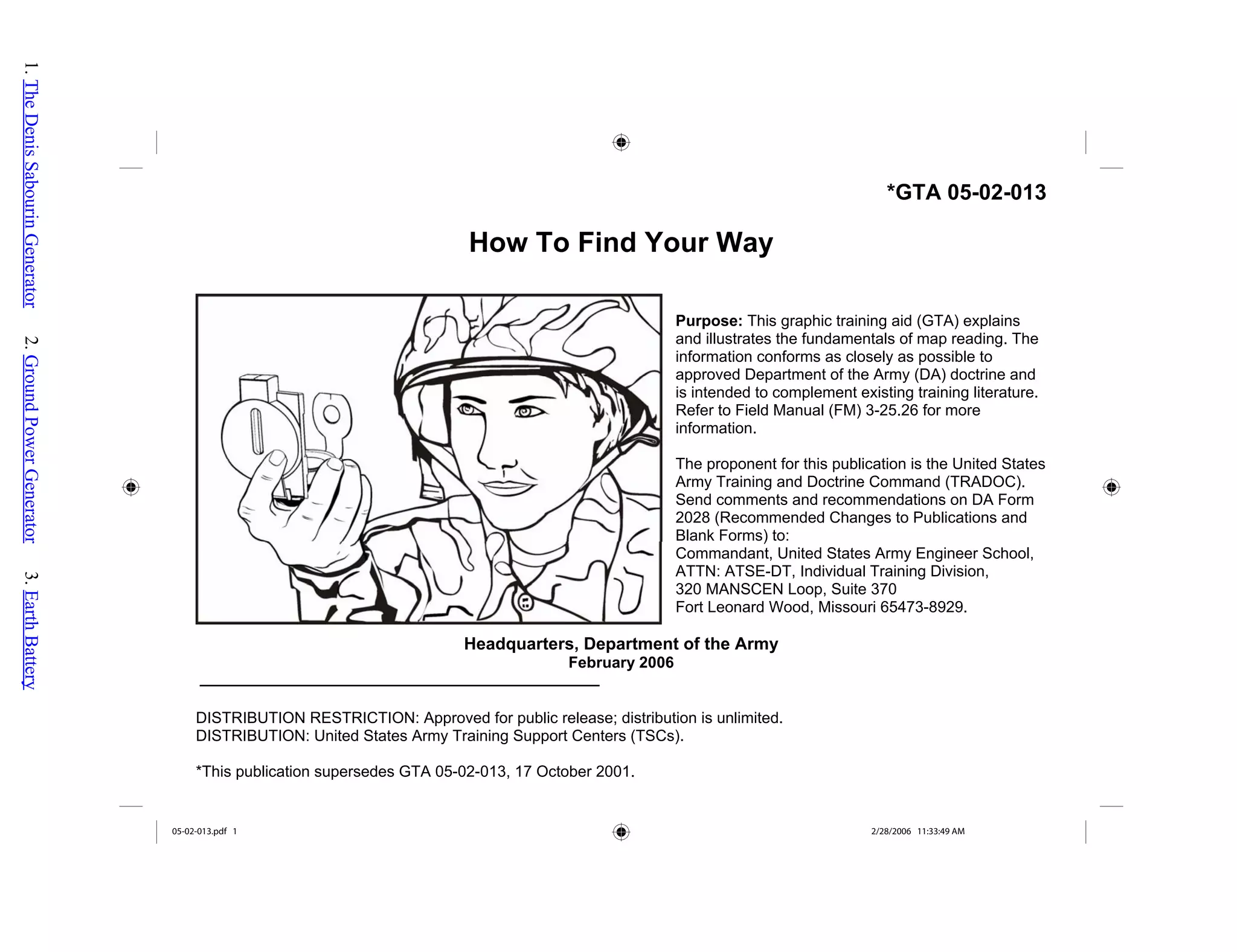 The document is a graphic training aid that details the fundamentals of map reading for military personnel, aligning with Army doctrine. It covers techniques for locating oneself, determining distances, and finding directions using maps and compasses. The publication serves as a supplementary resource to Field Manual FM 3-25.26, emphasizing the importance of navigation skills to prevent getting lost in combat situations.