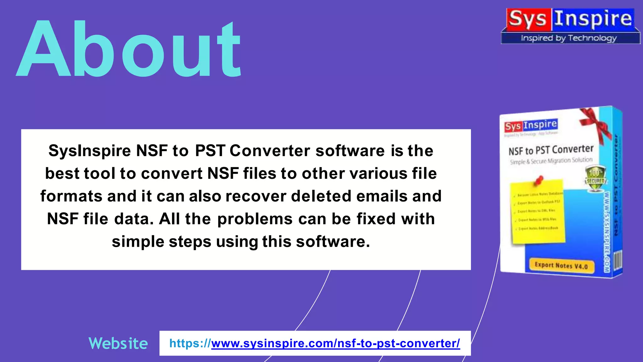The SysInspire NSF to PST Converter is a software tool that facilitates the conversion of NSF files to various formats such as PST, HTML, and Office 365, while also recovering deleted emails. It includes features like a free demo version, the ability to split large PST files, and support for different Windows and Outlook versions. Additionally, the software allows users to migrate Lotus Notes data to cloud services like Gmail and Yahoo Mail.