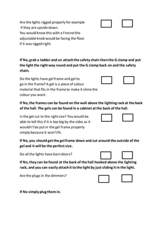 This document provides instructions for setting up stage lighting equipment. It asks a series of yes/no questions to check that key components are in place and properly installed, including ensuring there are enough fresnel lights, safety chains are attached, G-clamps are correctly positioned, lights are the right way up, gels and frames are installed, barn doors are attached, plugs are in dimmers and sockets match, and the lamp tray and main power plug are securely connected. Instructions are provided for resolving any issues.