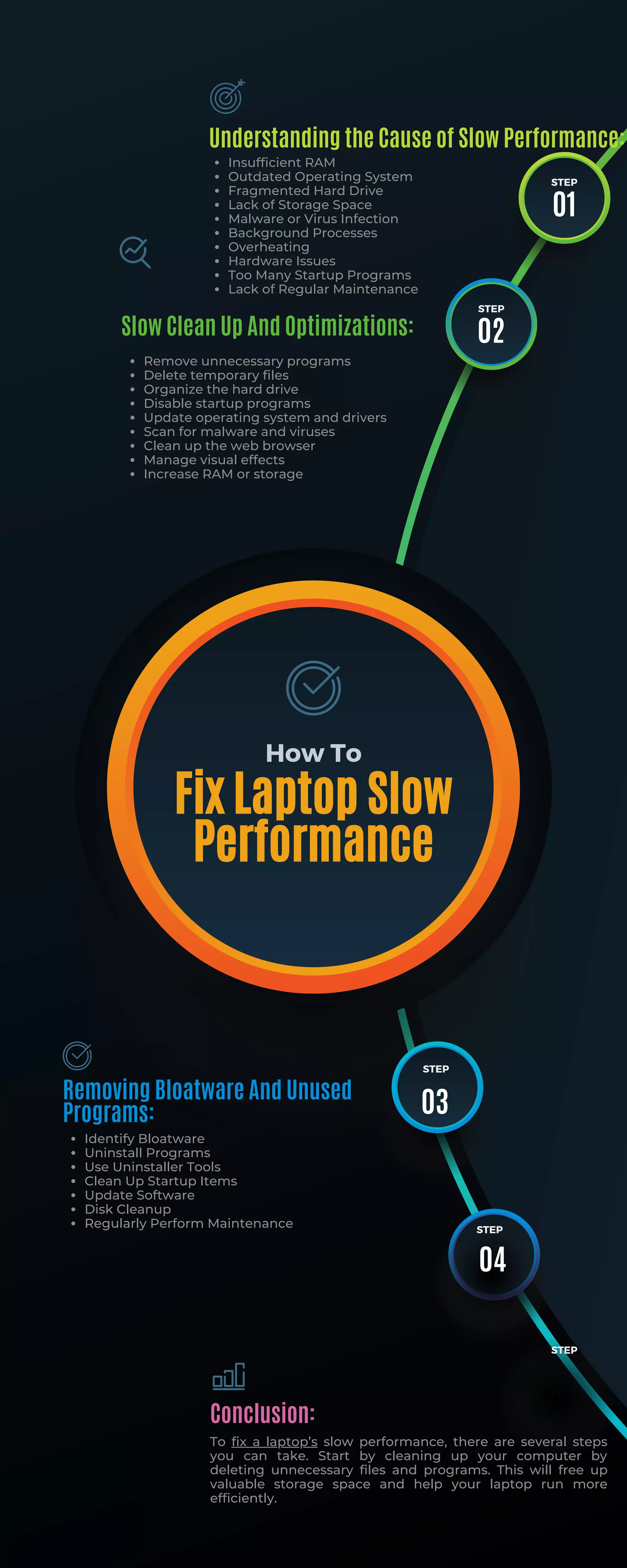 The document outlines the causes of slow laptop performance, including insufficient RAM, outdated operating systems, and malware. It provides various steps to improve performance, such as cleaning up files, removing unnecessary programs, and updating software. Regular maintenance and optimizing settings are also recommended to ensure better efficiency.