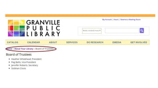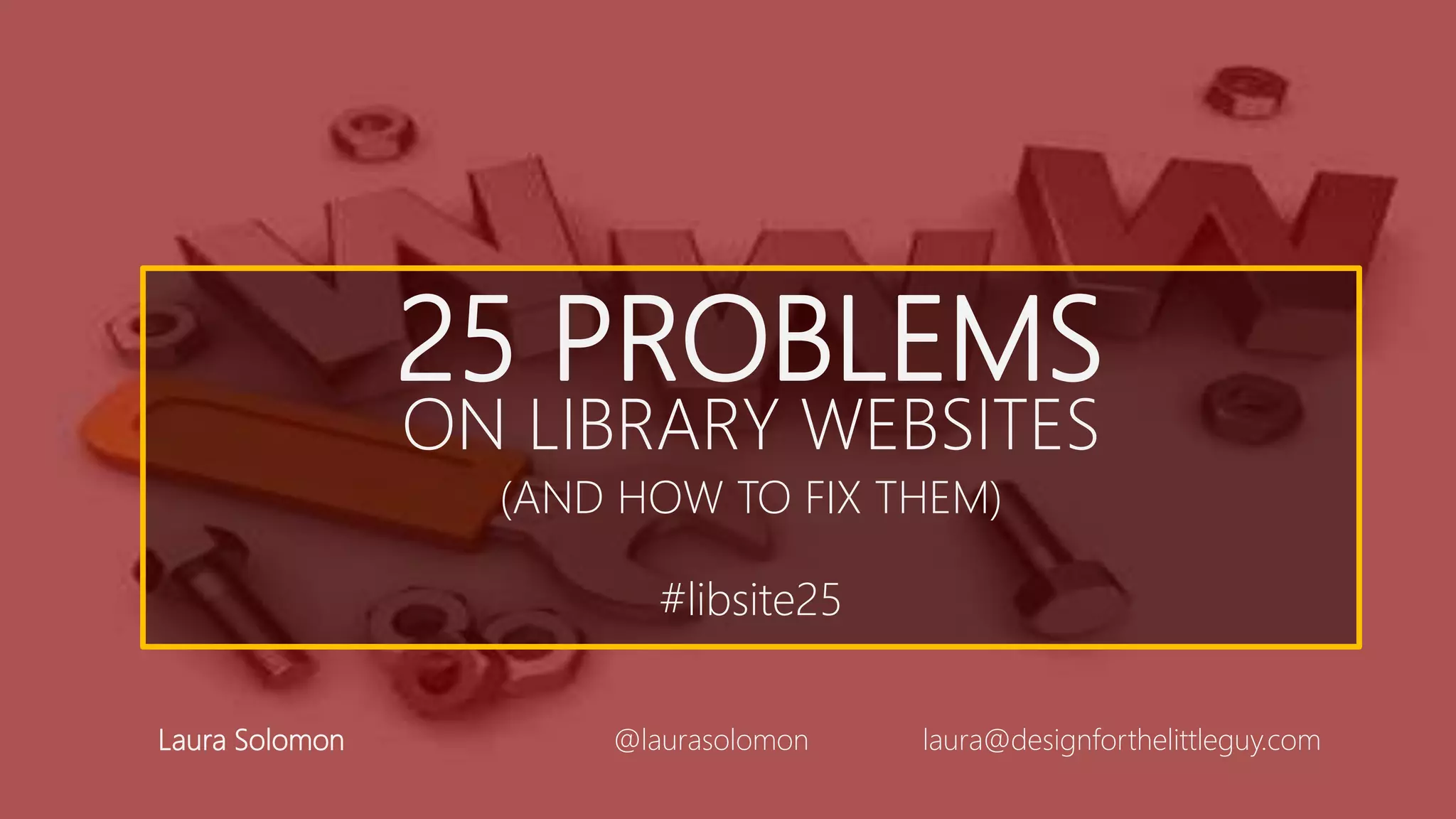 This document outlines 25 common problems found on library websites and provides suggestions for how to fix them. The problems are organized into four categories: missing but not forgotten, everybody else got the memo, search headaches, and major league problems. Suggested fixes range from simple changes that can be made by library staff to more complex issues that may require hiring a professional web developer. The overall goal is to make library websites more user-friendly, accessible, and responsive to patron needs.