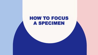 The document provides step-by-step procedures for focusing a specimen using a microscope, including cleaning the glass surfaces and adjusting the light. It also describes the method of wet mounting a specimen, emphasizing the materials needed and the technique to minimize air bubbles. Key questions related to the procedure are included to enhance understanding and troubleshooting.