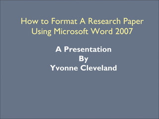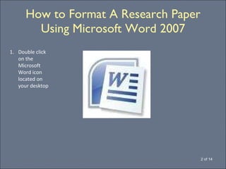 The document provides instructions for formatting a research paper using Microsoft Word 2007. It details how to set margins at 1 inch top, 1.5 inches left, 0.5 inches right, and 1 inch bottom. It also explains how to insert page breaks, center the title, and spell check the paper before printing. The instructions are presented over 14 slides.