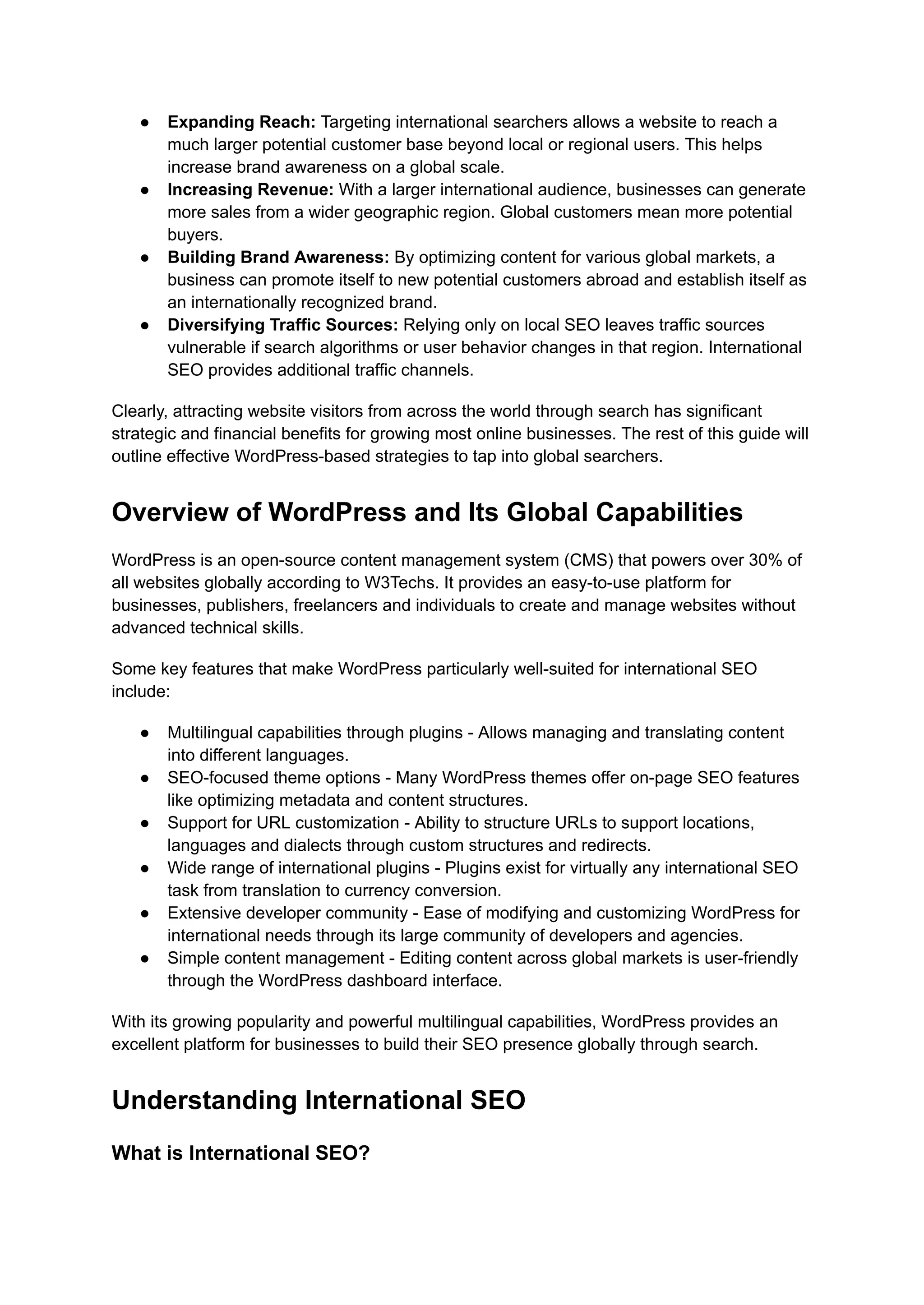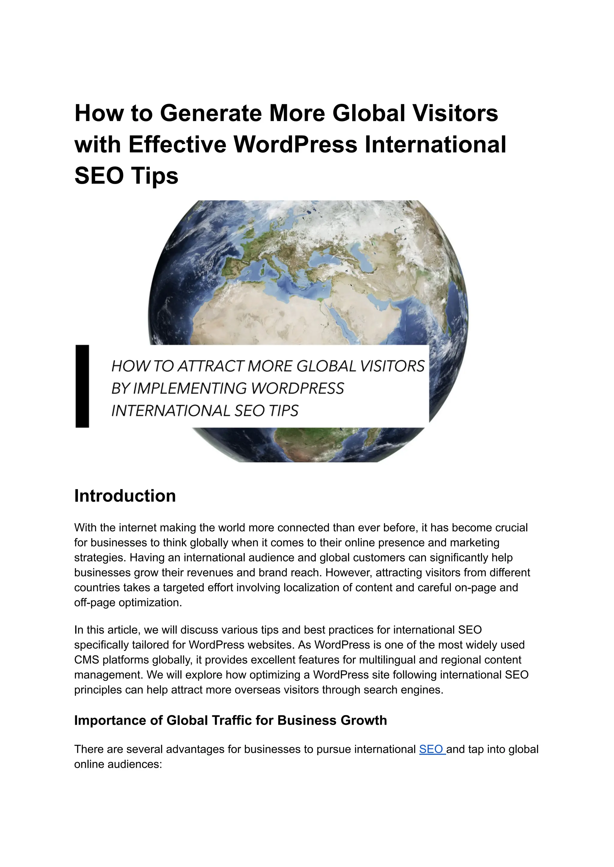 The document provides comprehensive tips for optimizing WordPress websites for international SEO, highlighting the importance of attracting global visitors to enhance business growth. Key practices include effective keyword research, localized content creation, technical implementations like hreflang tags, and leveraging multilingual plugins. It emphasizes the need for continuous adaptation and learning to stay competitive in an evolving digital landscape.