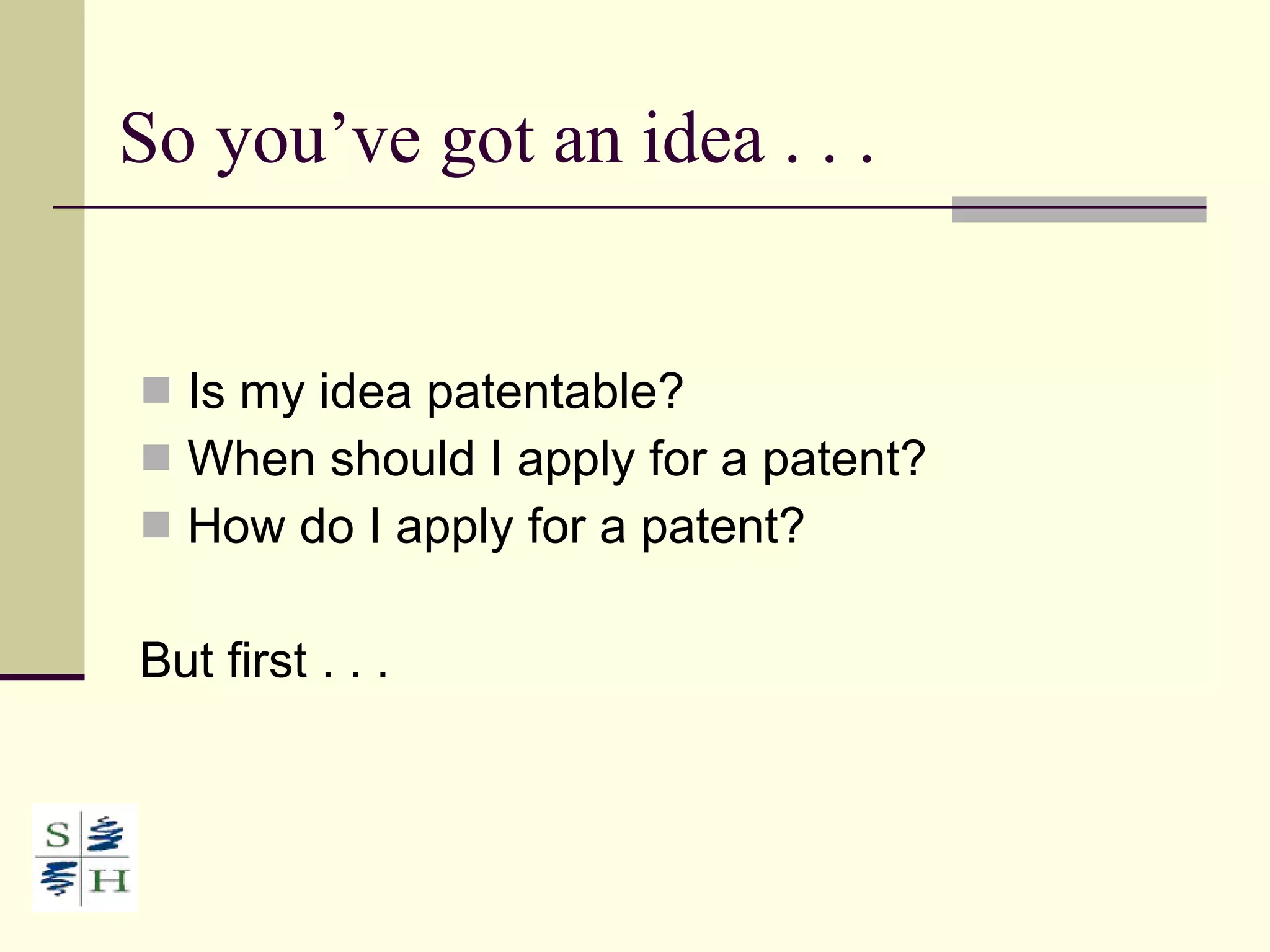 This document provides an introduction to patents, including what constitutes a patentable idea under US law. It discusses the requirements for an idea to be patentable - that it must demonstrate appropriate subject matter, usefulness, novelty, non-obviousness, and enablement. It also outlines the patent application process and recommends applying for a patent within one year of any public disclosure of an idea to maintain patent rights.
