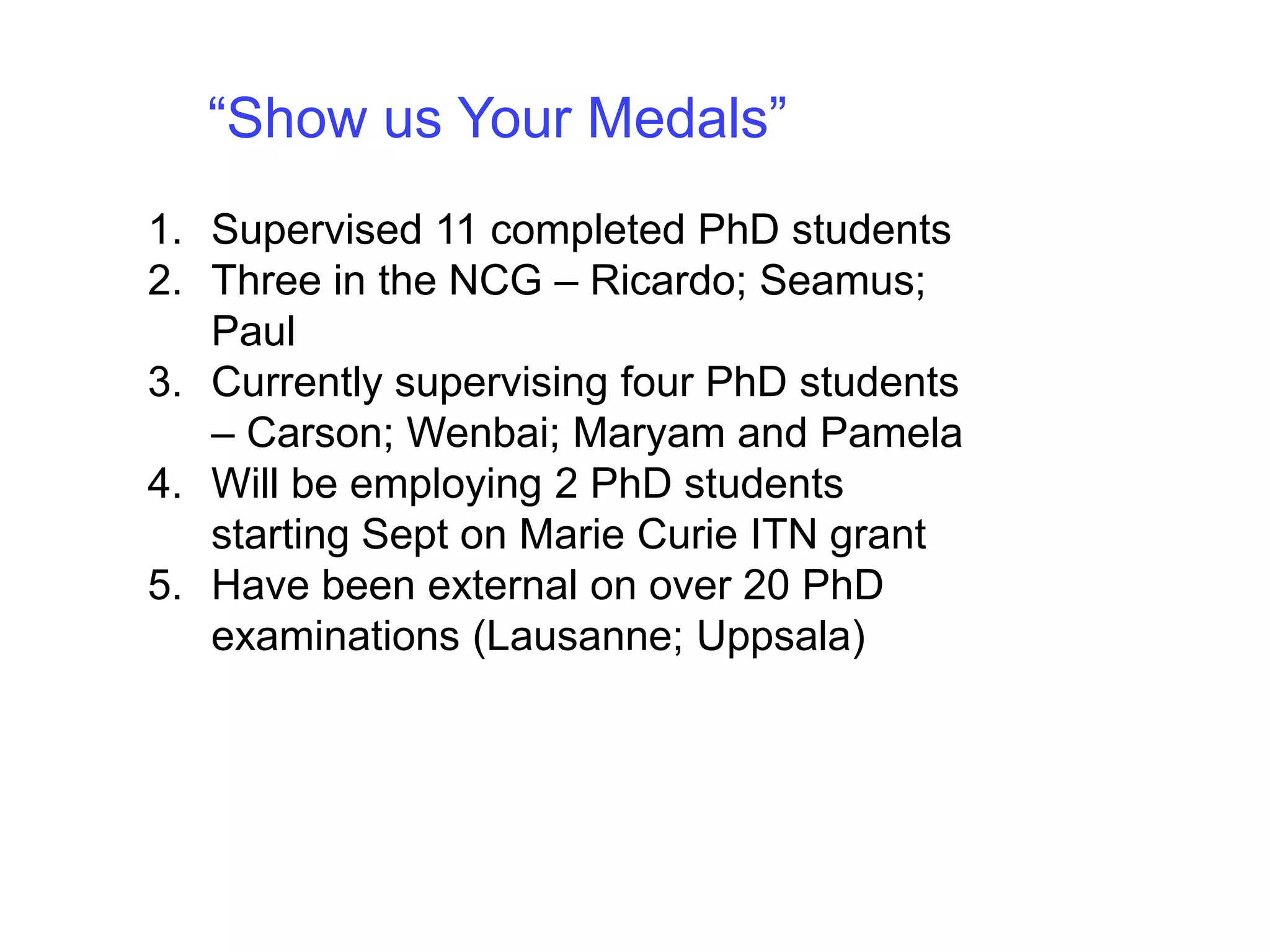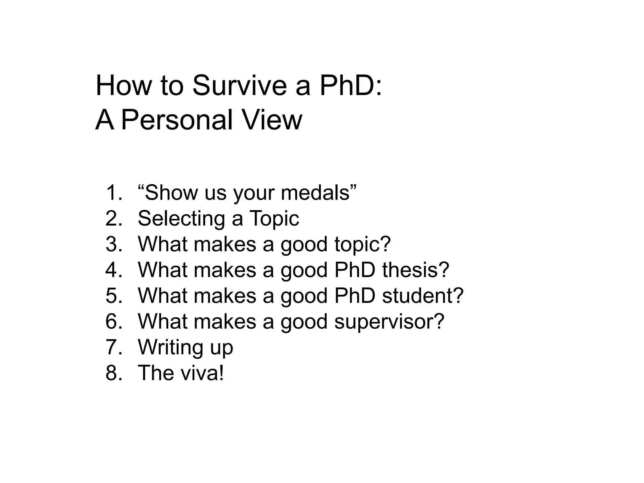 The document provides advice on various aspects of completing a PhD, including selecting a topic, writing a thesis, being a good PhD student and supervisor, and completing the viva. It recommends selecting a topic that addresses gaps in existing research and adds to the knowledge base. A good thesis introduces the problem well, demonstrates expertise, and shows how the problem was solved. Being a good PhD student requires intelligence, creativity, hard work, and endurance. A good supervisor provides guidance, timely feedback, and inspiration. Writing up takes longer than expected, so chapters should be reviewed early. Meeting deadlines is important to avoid graduation delays. The viva involves a presentation and questioning from examiners.