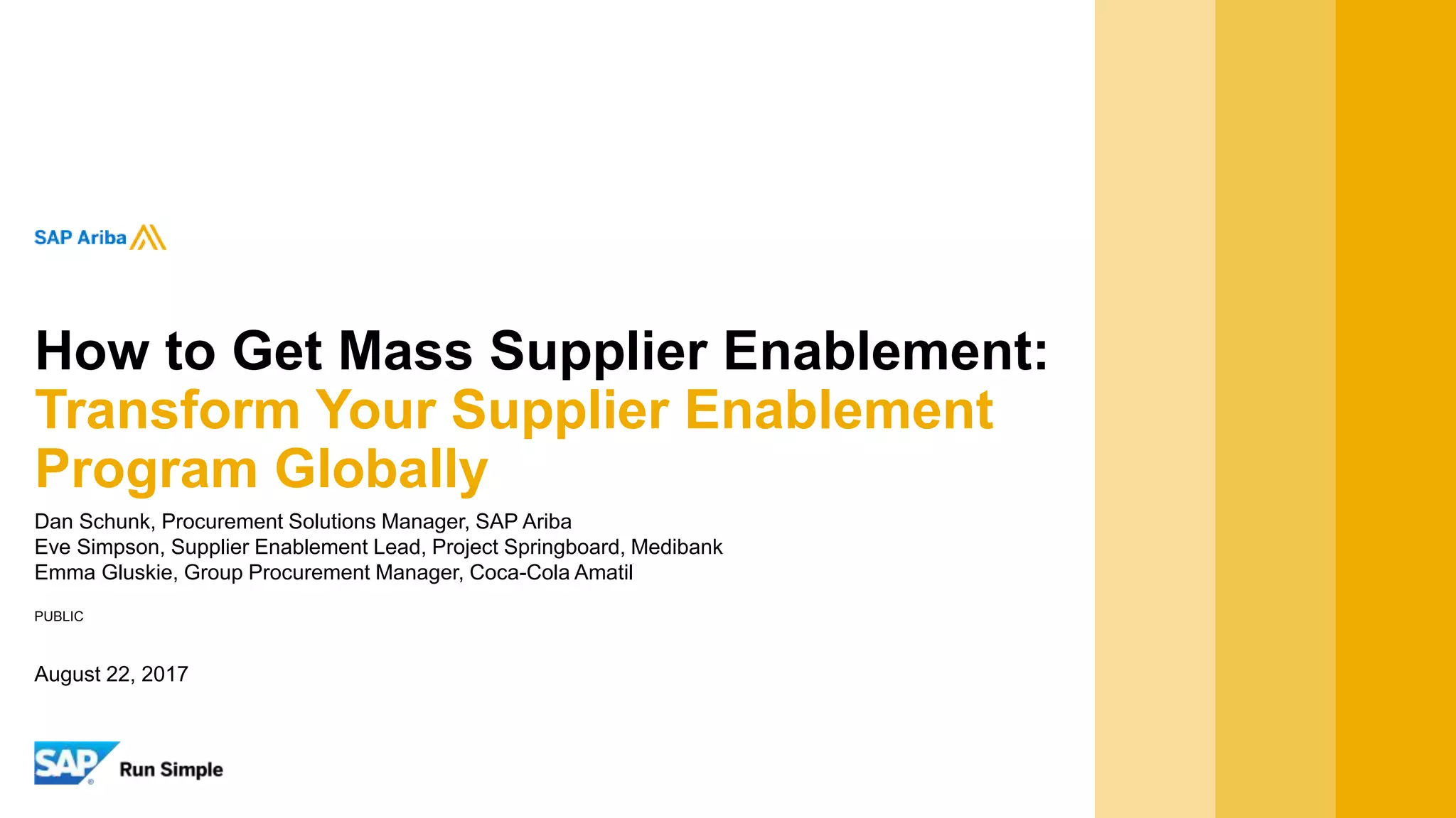 The document discusses strategies for enhancing supplier enablement globally through methodologies like light enablement from SAP Ariba. It outlines best practices for onboarding suppliers, including segmentation and the use of technology to streamline processes and improve efficiency. Various case studies from Medibank and Coca-Cola Amatil illustrate the benefits and implementation of these strategies in their procurement programs.