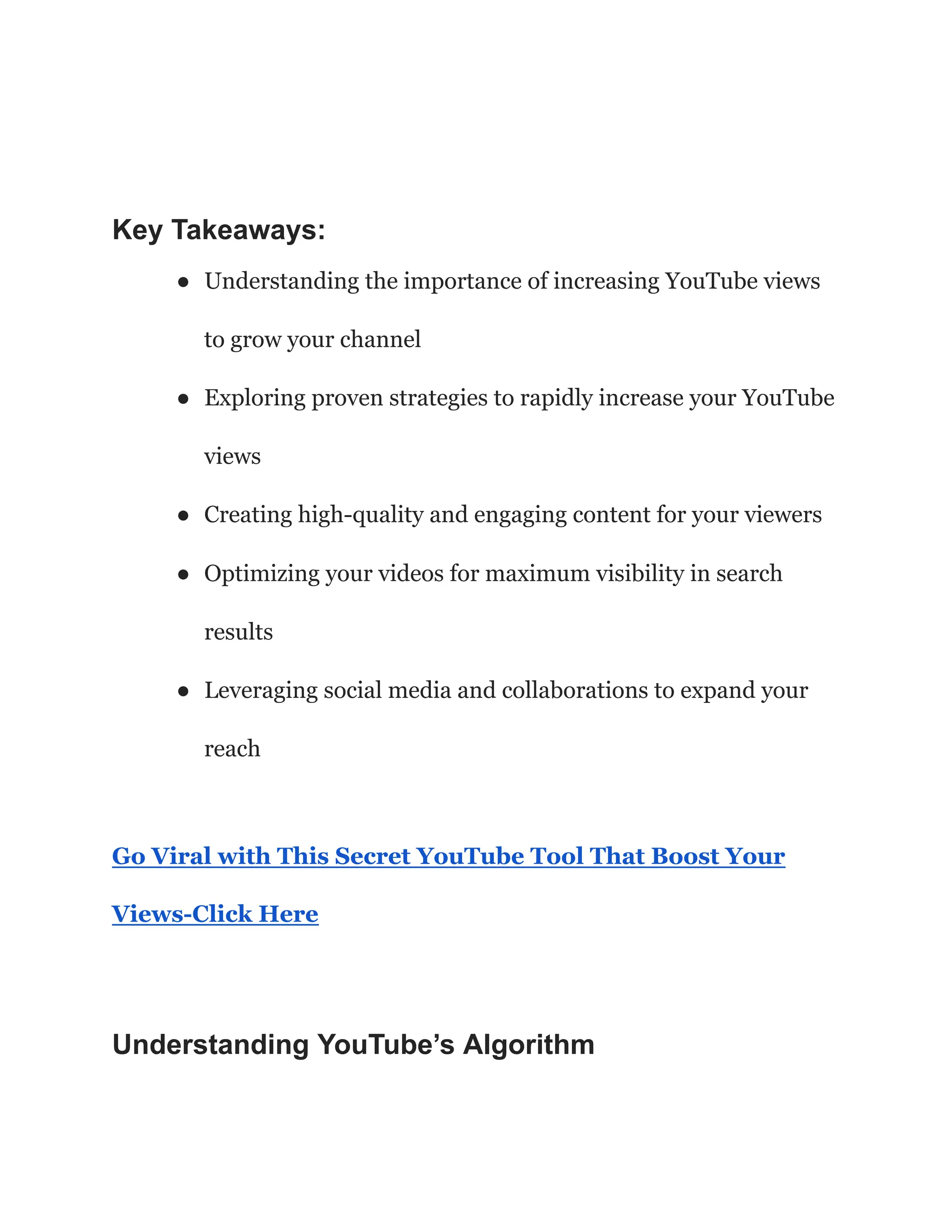 This guide provides effective strategies for quickly increasing views on YouTube, emphasizing the importance of high-quality content, video optimization, and understanding the platform's algorithm. Key techniques include conducting keyword research, creating engaging titles and thumbnails, promoting videos on social media, and collaborating with other creators. The document encourages consistent effort and analytics to track progress for continued growth on the platform.