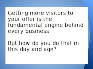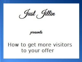 When it comes to running business the need to get more visitors to your offer or presentation is critical. This presentation goes over eleven strategies to get more visitors to look at your offer or website. For more ideas, tips and strategies to build your MLM or internet marketing business online be sure to visit http://www.justjillin.com and like our fan page over at http://www.facebook.com/just.jillin.jill.e.hart