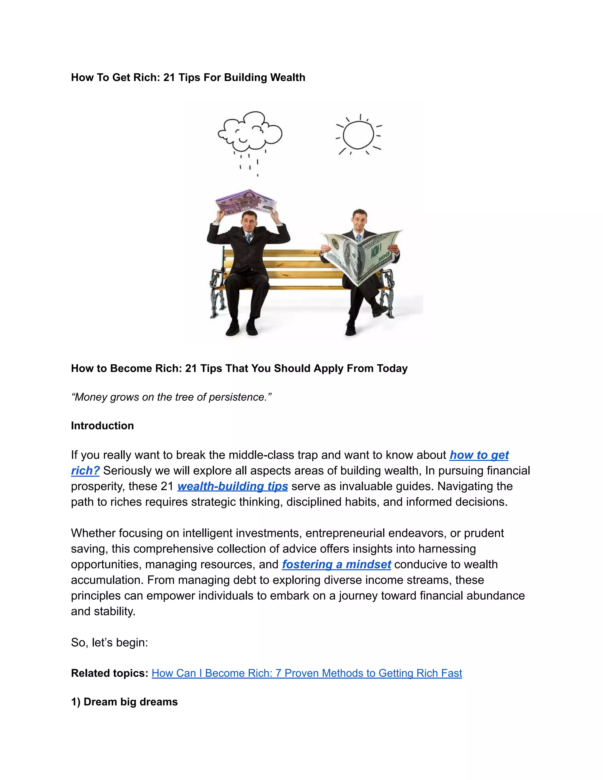 The document outlines 21 essential tips for building wealth and achieving financial prosperity, emphasizing the importance of mindset, strategic planning, and disciplined habits. Key principles include dreaming big, continuous learning, self-discipline, and surrounding oneself with supportive individuals. Overall, the guide encourages a proactive approach to financial planning and persistence in the face of challenges to secure a prosperous future.