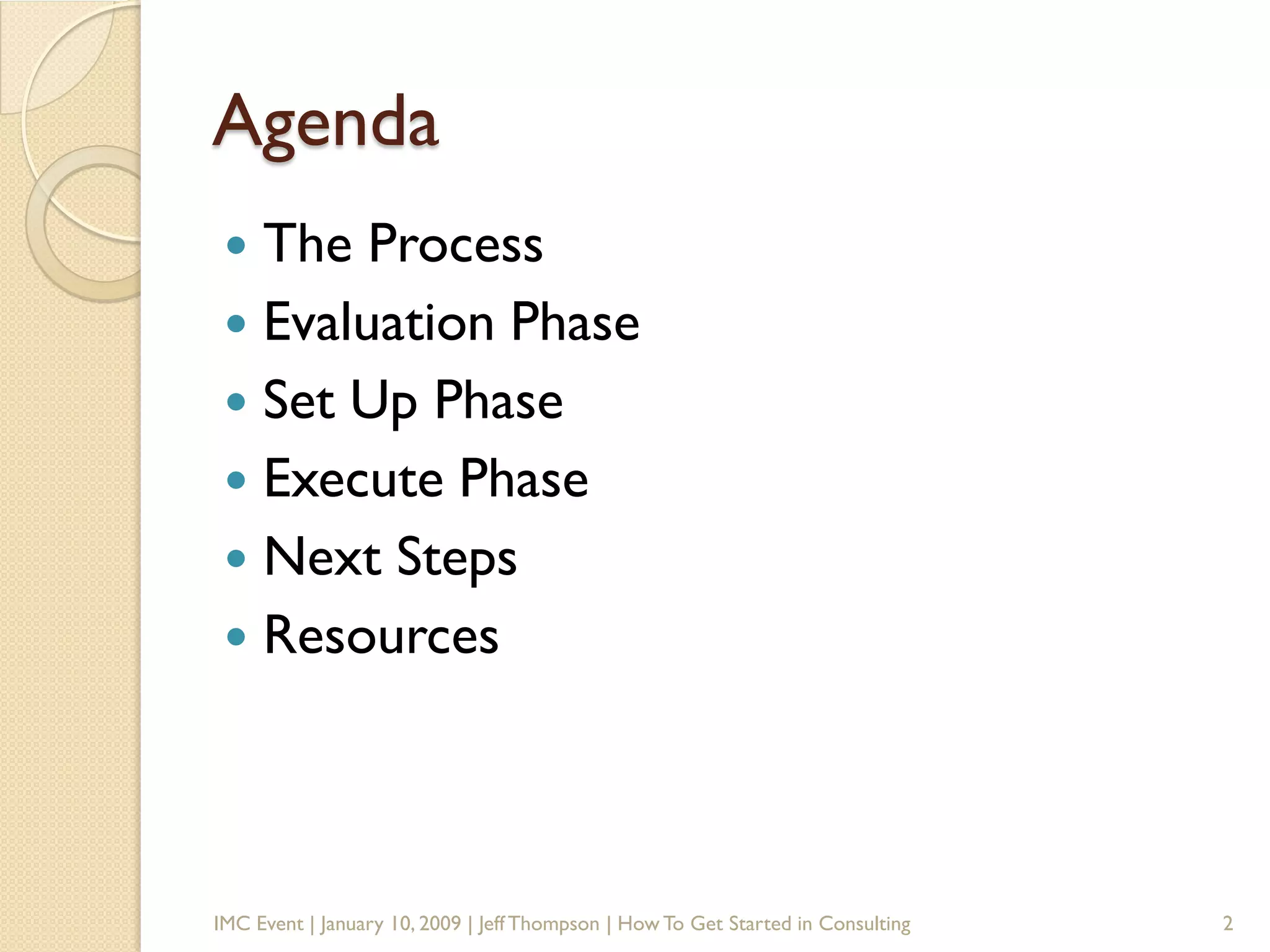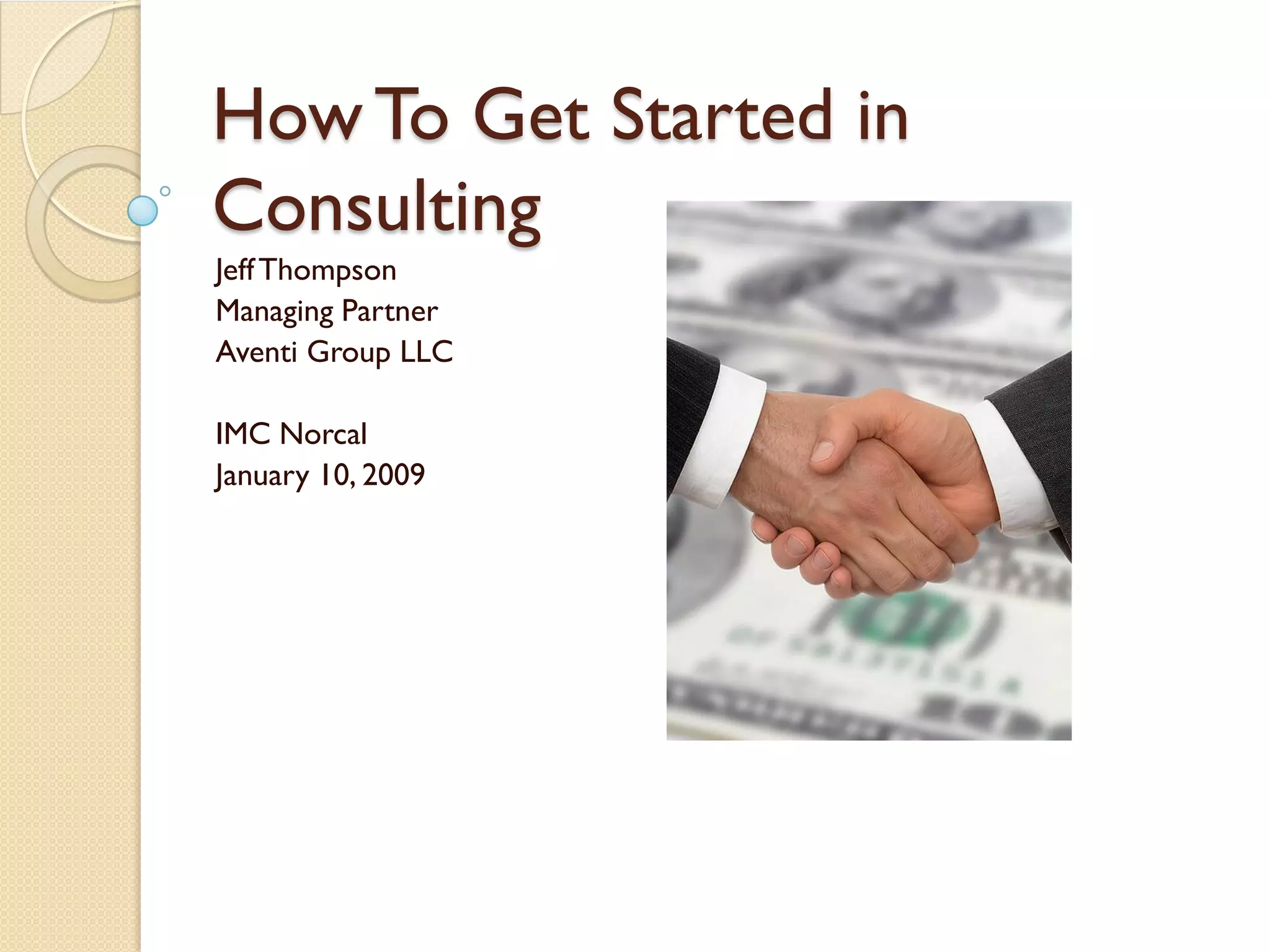 Jeff Thompson presented on how to get started in consulting. He outlined a 3 phase process: 1) Evaluation phase to understand motivations and assess skills, 2) Set up phase to develop marketing materials and infrastructure, and 3) Execution phase to launch business through networking, sales, and developing a pipeline. The presentation provided detailed steps and considerations for each phase to help attendees successfully transition to a consulting career.