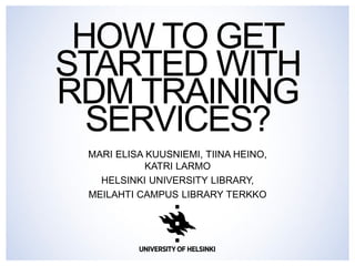 The document outlines the initiation and structure of research data management (RDM) training services at the University of Helsinki, emphasizing in-house training for librarians and integrating RDM into doctoral education. Key activities included workshops on various RDM topics, collaborations with researchers, and the development of a comprehensive support plan for RDM services. Future plans involve expanding training sessions and integrating RDM into university curricula.