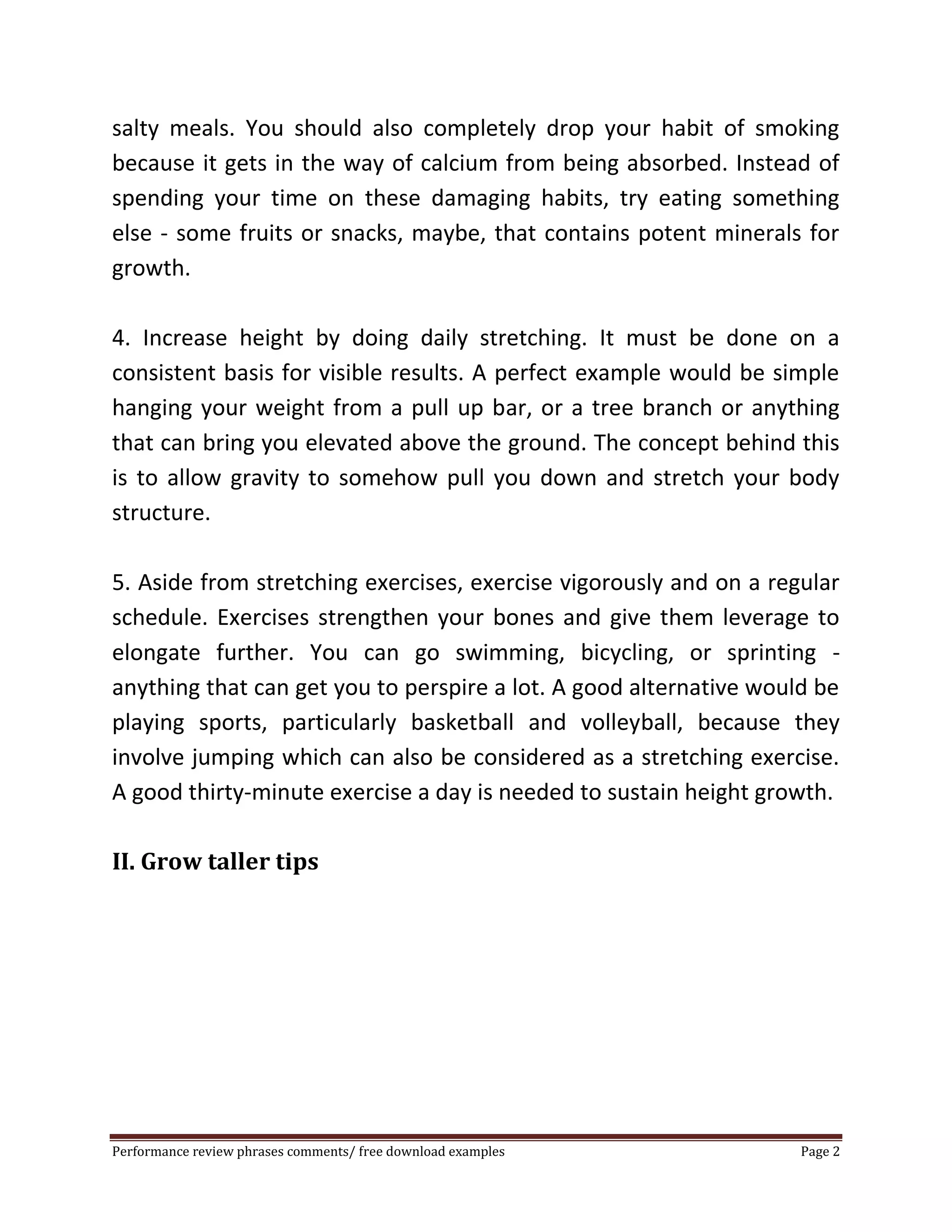 This document provides tips on how to get taller by up to 4 inches, including maintaining a healthy diet with vitamins and minerals that support growth, exercising regularly through activities like stretching and sports, getting adequate sleep, and avoiding habits like smoking or drinking alcohol that can stunt growth. The tips are intended for people still growing who want to maximize their height potential through lifestyle factors within their control. Genetics are also acknowledged as a major determinant of height.